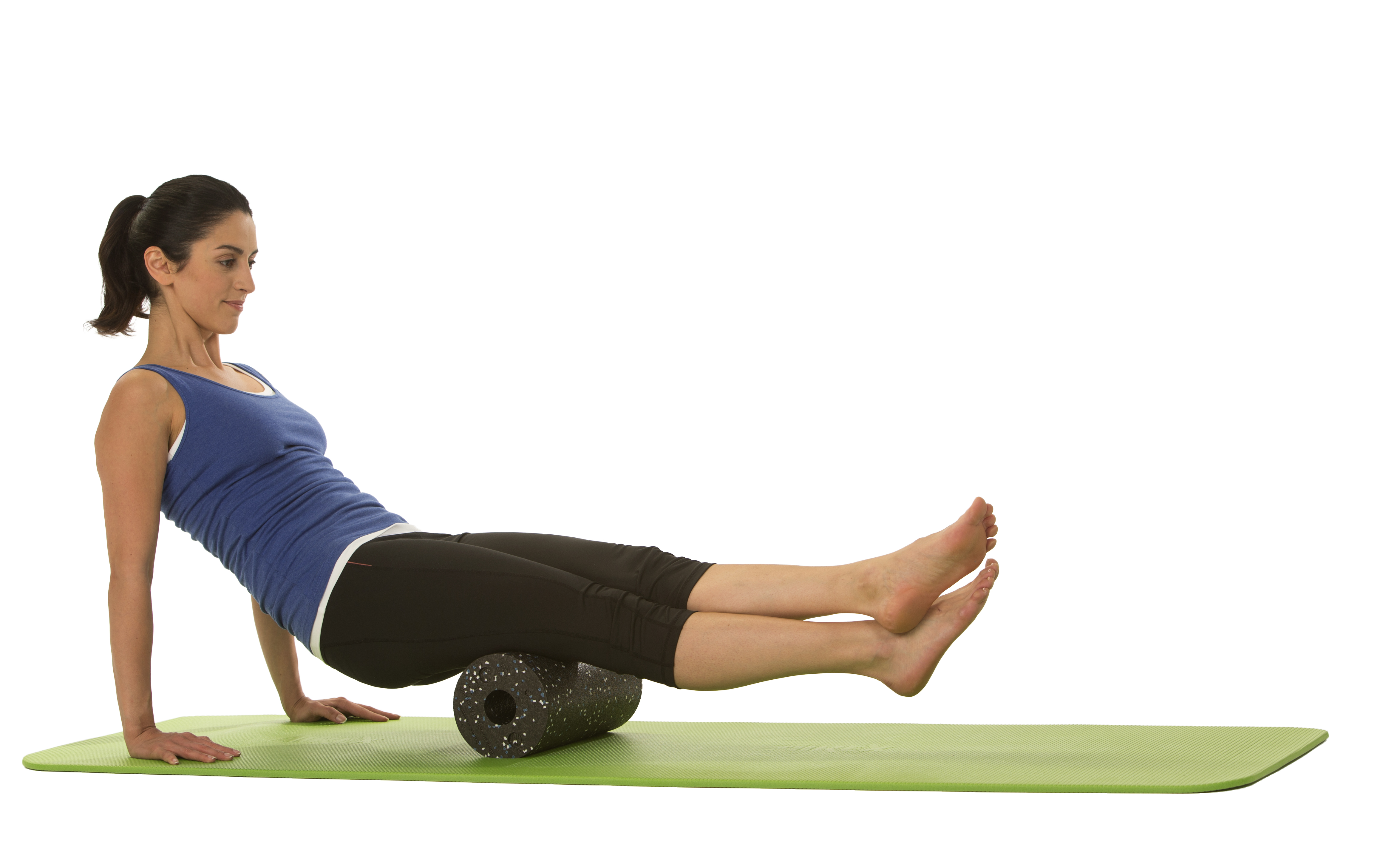 Übung 1: Stützen Sie sich mit den Händen hinter Ihrem Rücken auf dem Boden ab und platzieren Sie die Blackroll unter Ihren Oberschenkeln. Rollen Sie sich dann auf und ab, sodass die Blackroll die ganze Unterseite der Oberschenkel massiert.