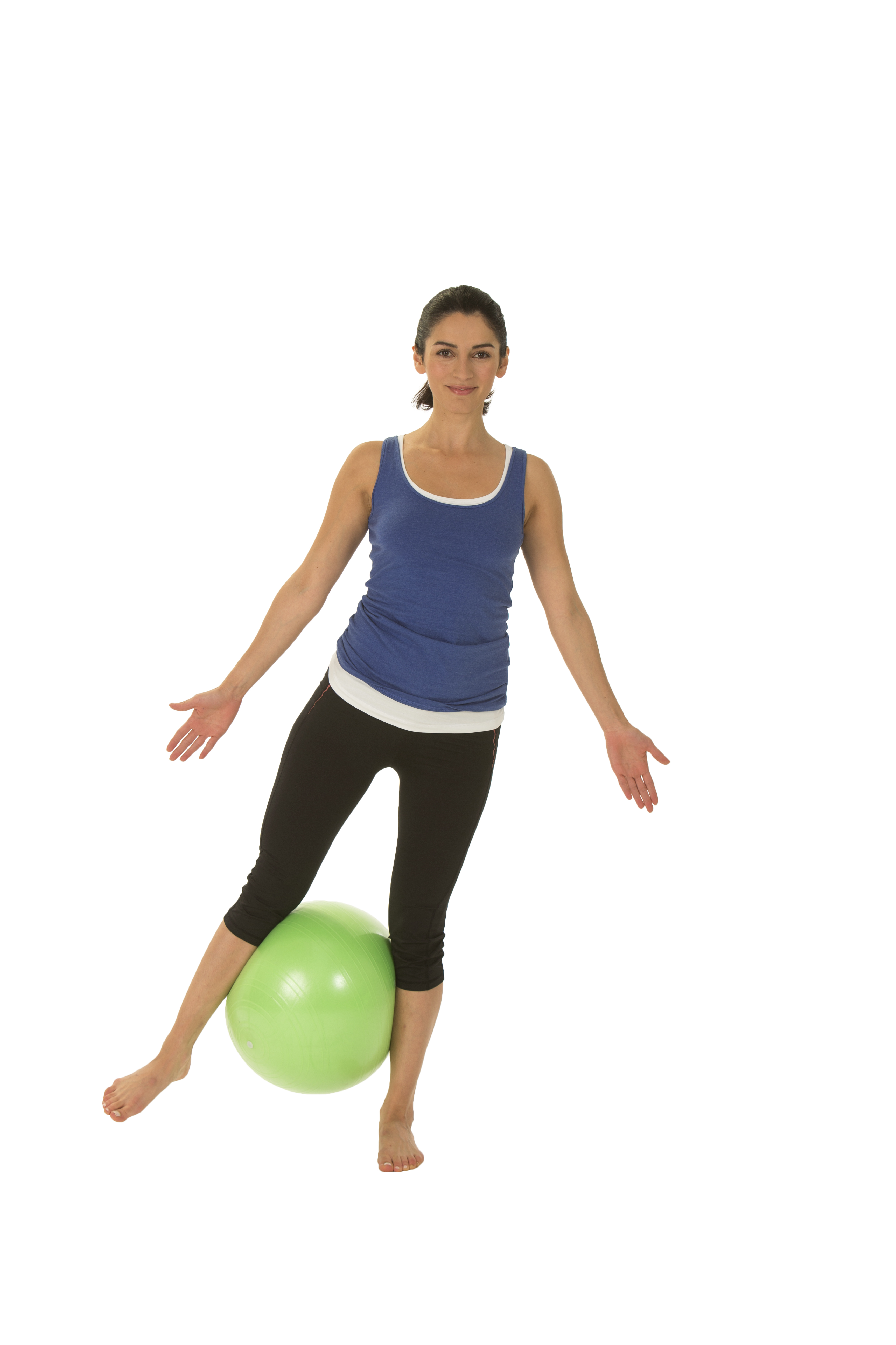 Übung 1: Klemmen Sie den „Redondo Ball Plus“ zwischen die Knie und strecken Sie die Arme seitlich nach unten aus. Verlagern Sie dann abwechselnd Ihr Gewicht auf das linke und rechte Bein.