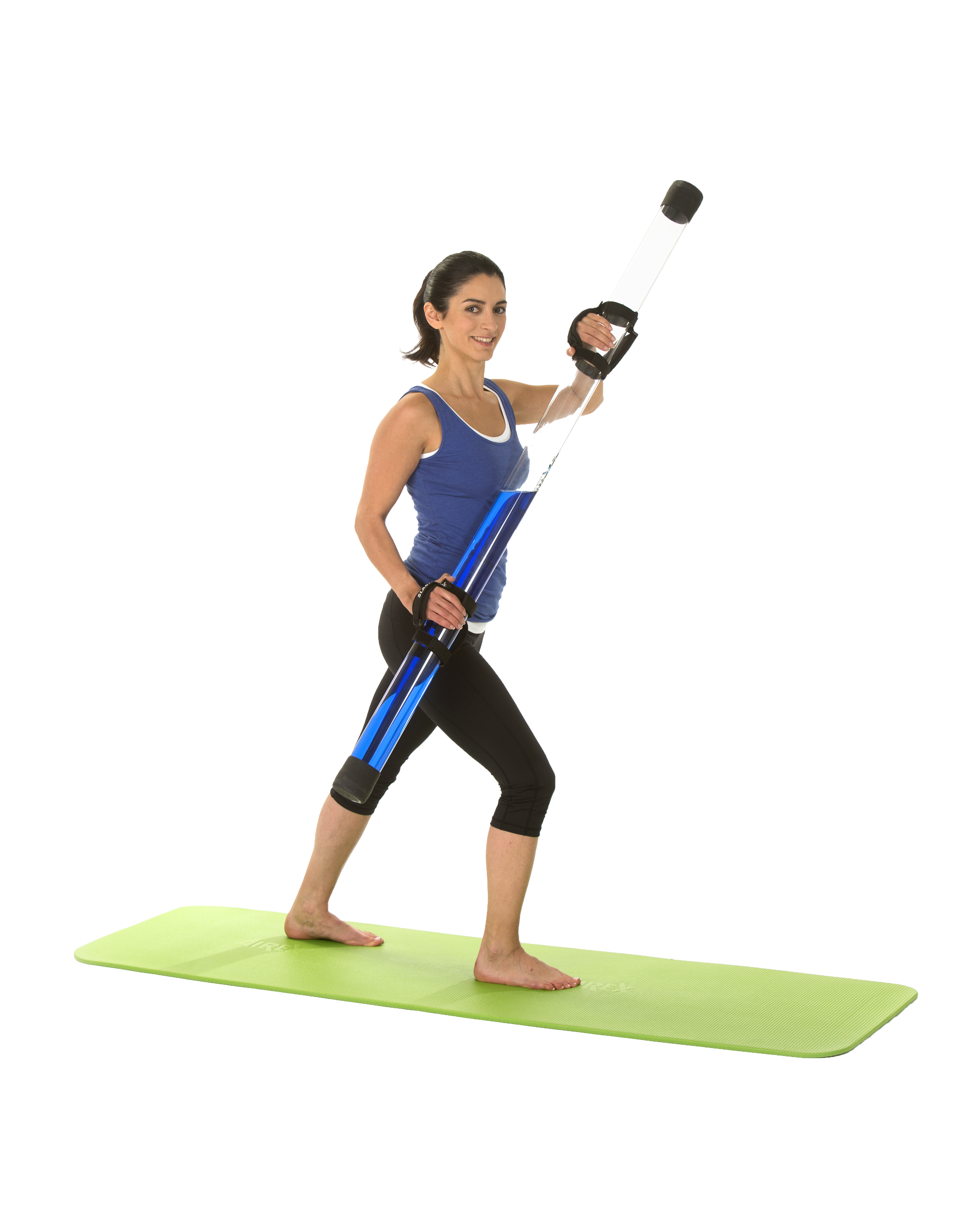 Übung 1: Halten Sie im Ausfallschritt die Slashpipe waagrecht vor den Körper. Bringen Sie dann ein Knie zum Boden und bewegen Sie gleichzeitig die Slashpipe nach oben über den Kopf. Achten Sie darauf, dass das Wasser in der Röhre immer im Gleichgewicht bleibt und die Slashpipe nicht zur Seite kippt.
