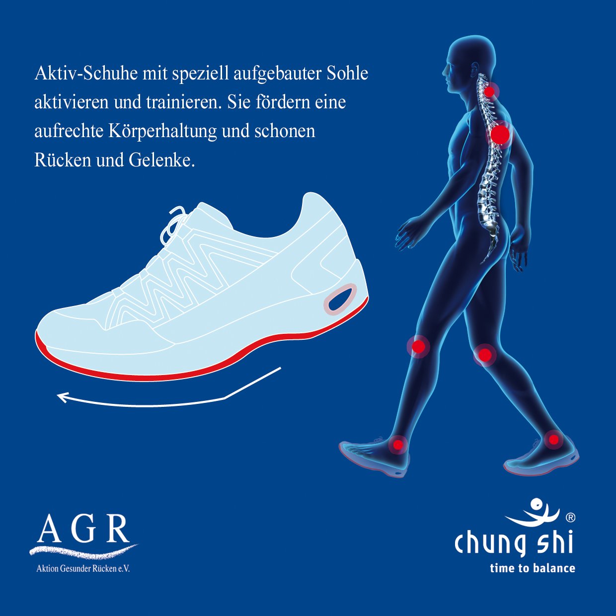 Rückenschmerzen können zahlreiche Ursachen haben – unter anderem unpassendes oder unbequemes Schuhwerk, aber vor allem wegen dem harten flachen Boden auf dem wir uns täglich bewegen. Die Aktion Gesunder Rücken (AGR) e. V. hat deswegen für Aktiv-, Freizeit-, Kinder- Sicherheits- und Prothesenschuhe sowie Clogs spezielle Kriterien definiert, die Füßen und Rücken gut tun. Neben der perfekten Passform kommt es dabei vor allem auf die Konstruktion und das Dämpfungssystem der Sohle an, um Stoßbelastungen beim Gehen auszugleichen. Ausgewählte Schuhmodelle verschiedener Hersteller wurden bereits mit dem AGR-Gütesiegel ausgezeichnet.