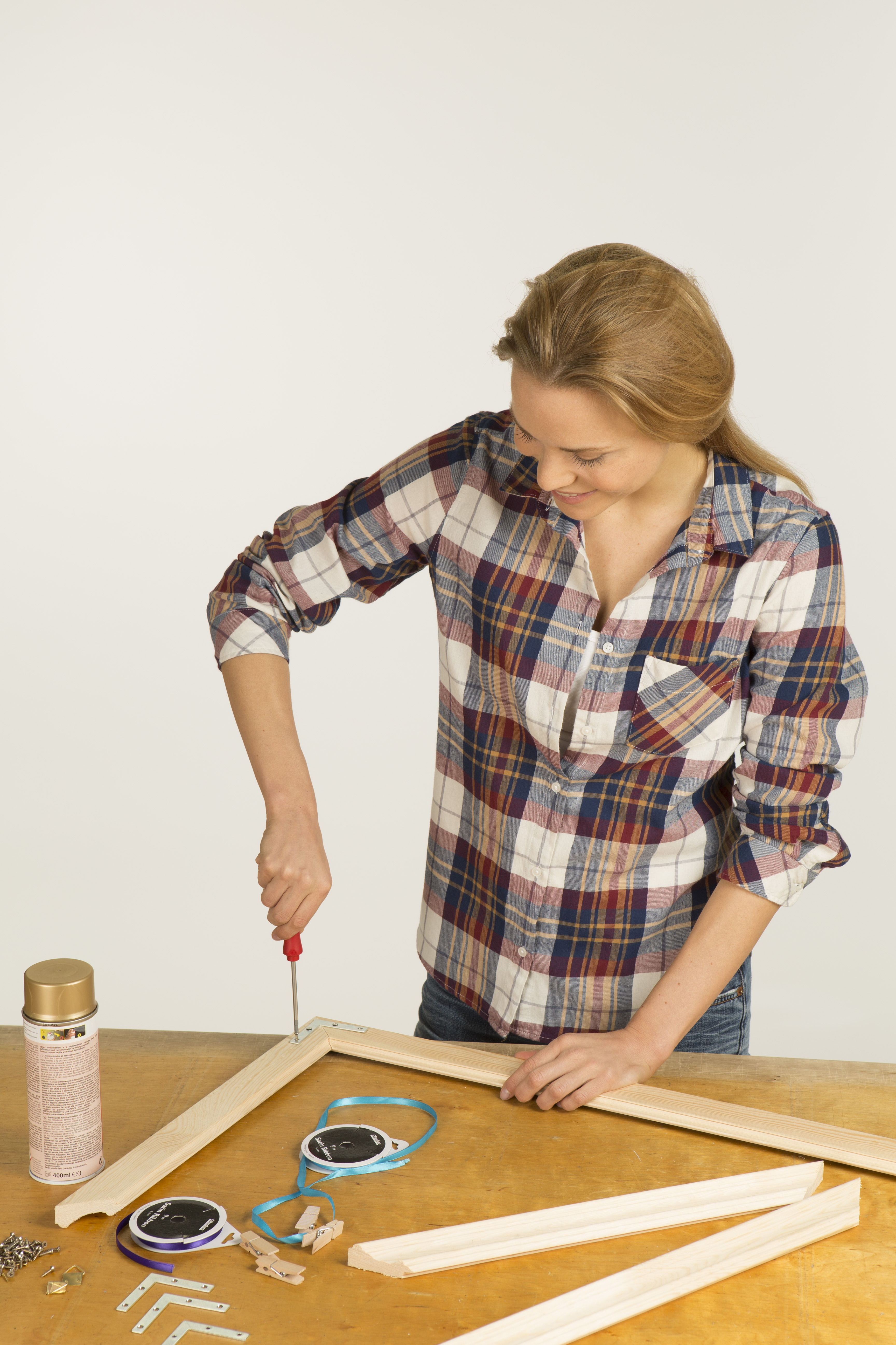 3. Satinband mehrmals quer über den Rahmen spannen und mithilfe von Schrauben an der Innenkante befestigen