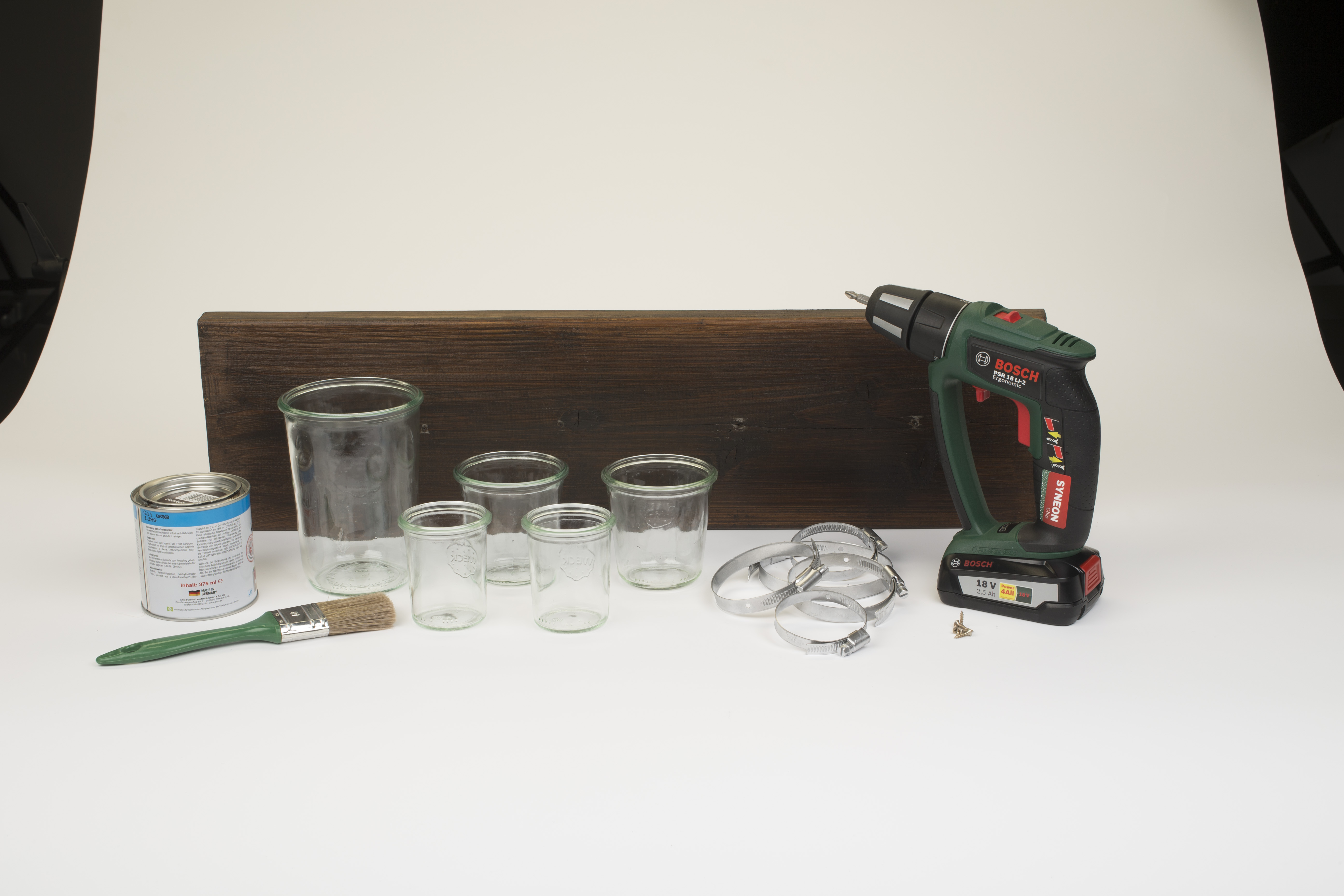 4. Weckgläser platzieren und die Schlauchschellen mithilfe des Akkubohrschraubers festziehen