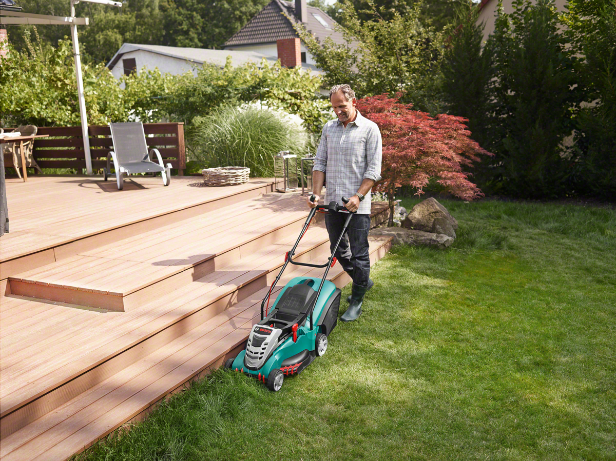 Ein gut gepflegter Rasen lässt Gärtnerherzen höher schlagen. Doch gerade Rasenmähen zählt – zumindest bei größeren Rasenflächen – zu den besonders anstrengenden Arbeiten. Die gekrümmte Körperhaltung und schwere, schlecht gängige Mäher beanspruchen Wirbelsäule und Gelenke. Rückenschonende Rasenmäher dagegen besitzen höhenverstellbare Holme, die eine aufrechte Körperhaltung beim Mähen ermöglichen. Ergonomisch geformte Griffe, die unterschiedliche Positionierungen der Hände erlauben, sorgen zusätzlich für eine gelenkschonende Handhabung. Alle Bedienelemente sind außerdem gut zu erreichen, die Mäher lassen sich unkompliziert manövrieren und verfügen über ein geringes Gewicht. Das AGR-Gütesiegel tragen viele Rasenmäher der Serie „Rotak“ von Bosch.
