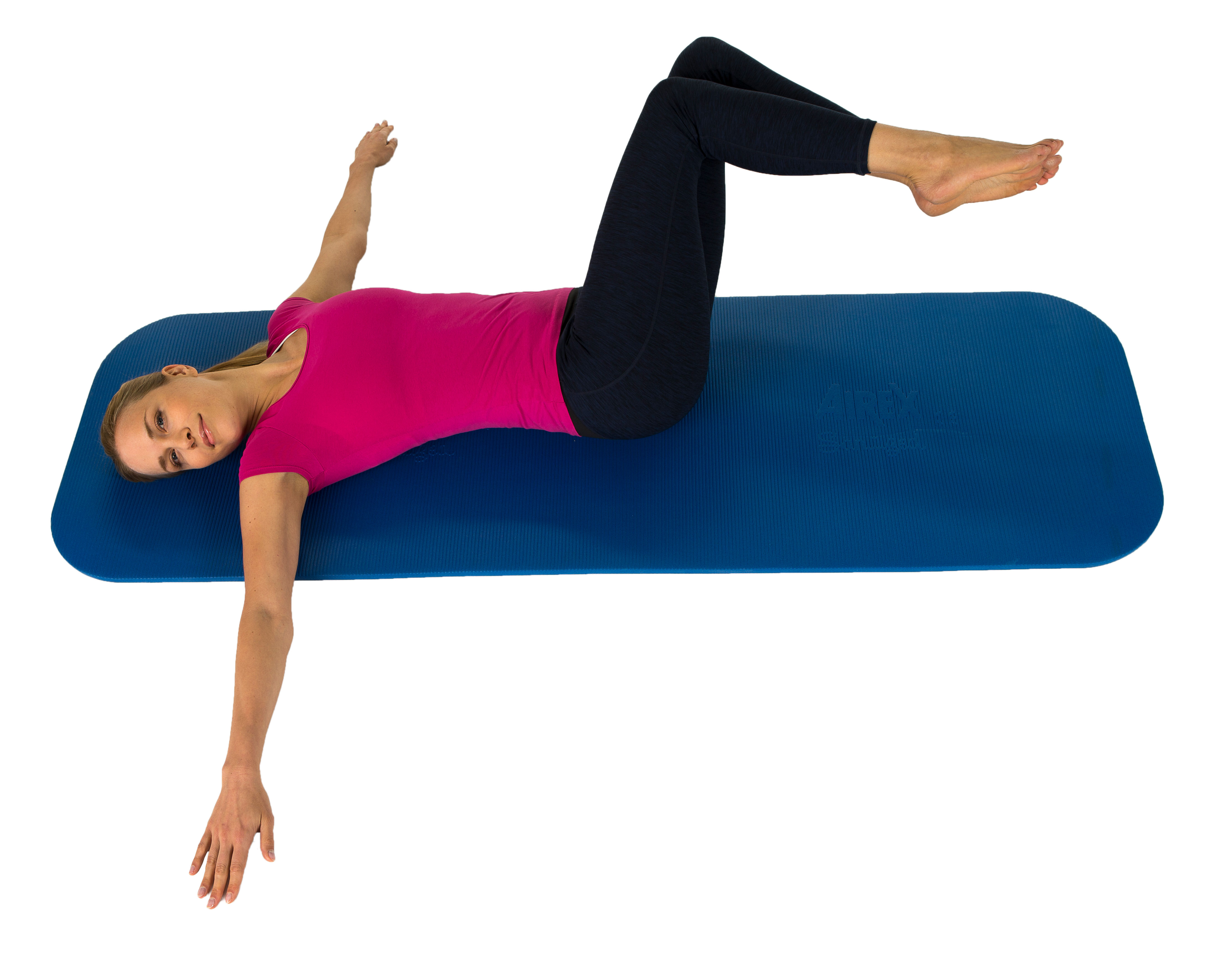 • Atmen Sie aus und kehren zur Mitte zurück. Anschließend die Beine nach links führen, die rechte Schulter bleibt am Boden. Wiederholen Sie die Übung mehrmals mit jeder Seite.