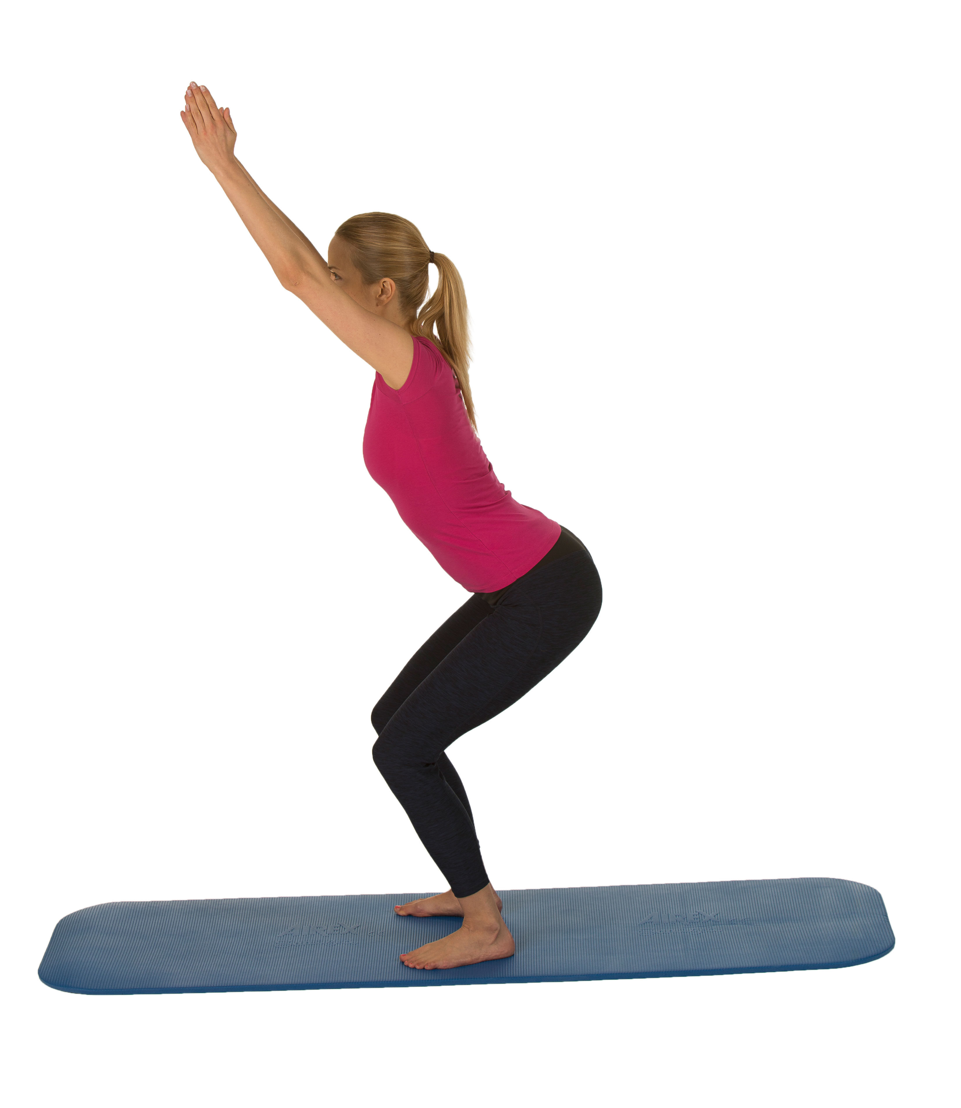 • Stellen Sie sich mit hüftbreit geöffneten Beinen auf die Matte, die Handflächen sind gegeneinander gedrückt. Die Knie sind leicht gebeugt. Kippen Sie das Becken und strecken Sie die Arme als Verlängerung der Wirbelsäule nach vorne, bis Sie eine leichte Hohlkreuzposition erreichen.