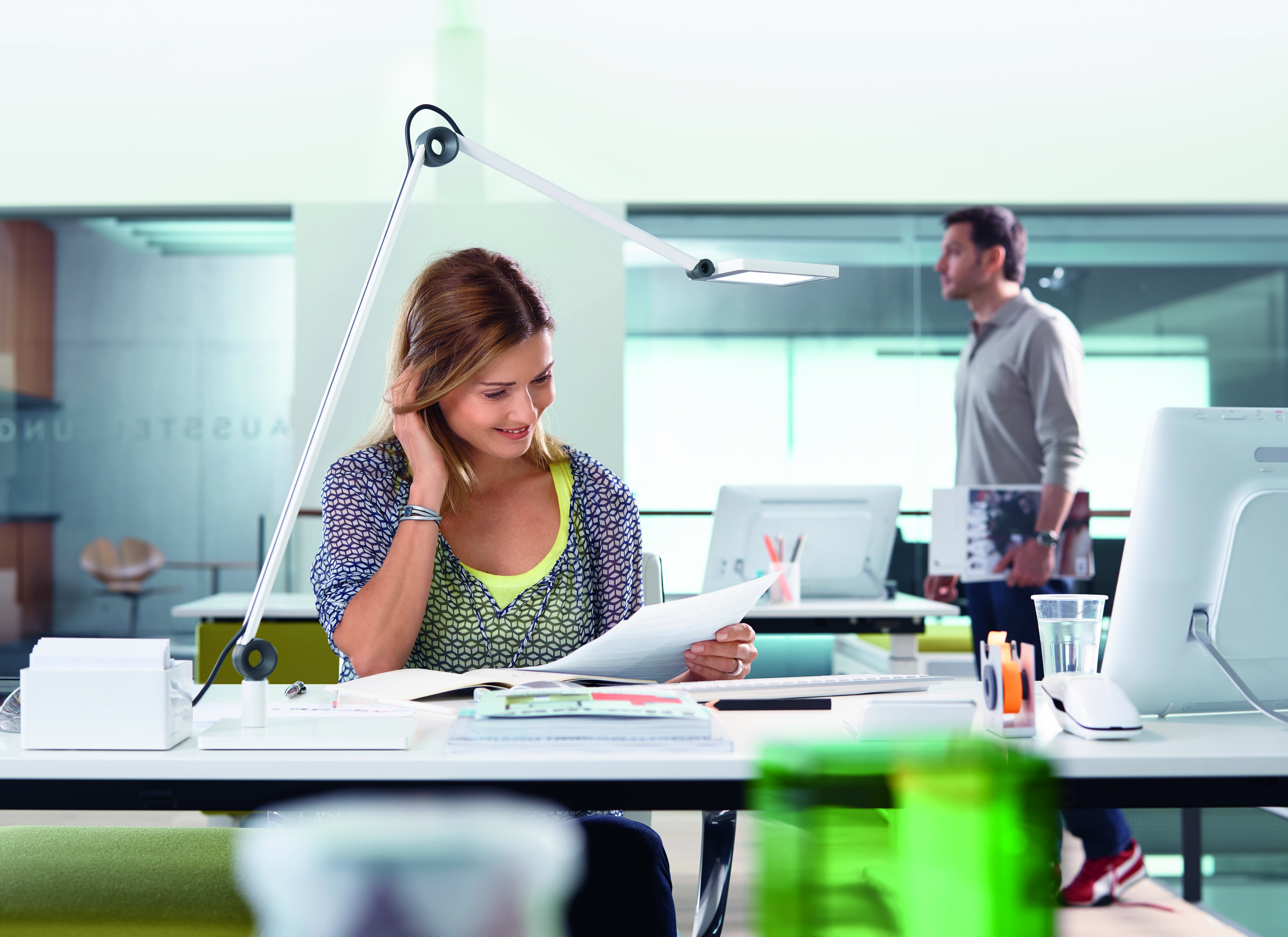 Was viele unterschätzen: Auch ein schlecht ausgeleuchteter Arbeitsplatz kann Fehlhaltungen begünstigen. Denn: Ist der Schreibtisch unzureichend beleuchtet, nehmen viele eine unphysiologische Zwangs-Haltung ein und lehnen sich etwa ständig vor um besser sehen zu können. Sinnvoll sind daher Lampen, die den Arbeitsplatz großflächig und gleichmäßig ausleuchten. Auf diese Weise wird der Kontrast zwischen Computerbildschirm und der Umgebung erhöht und die Sicht verbessert. Wichtig sind außerdem unterschiedliche Beleuchtungsstärken, Farbtemperaturen und leichte Verstellmöglichkeiten. Außerdem sollten die Lampen blendfrei sein und keine störenden Schatten werfen.