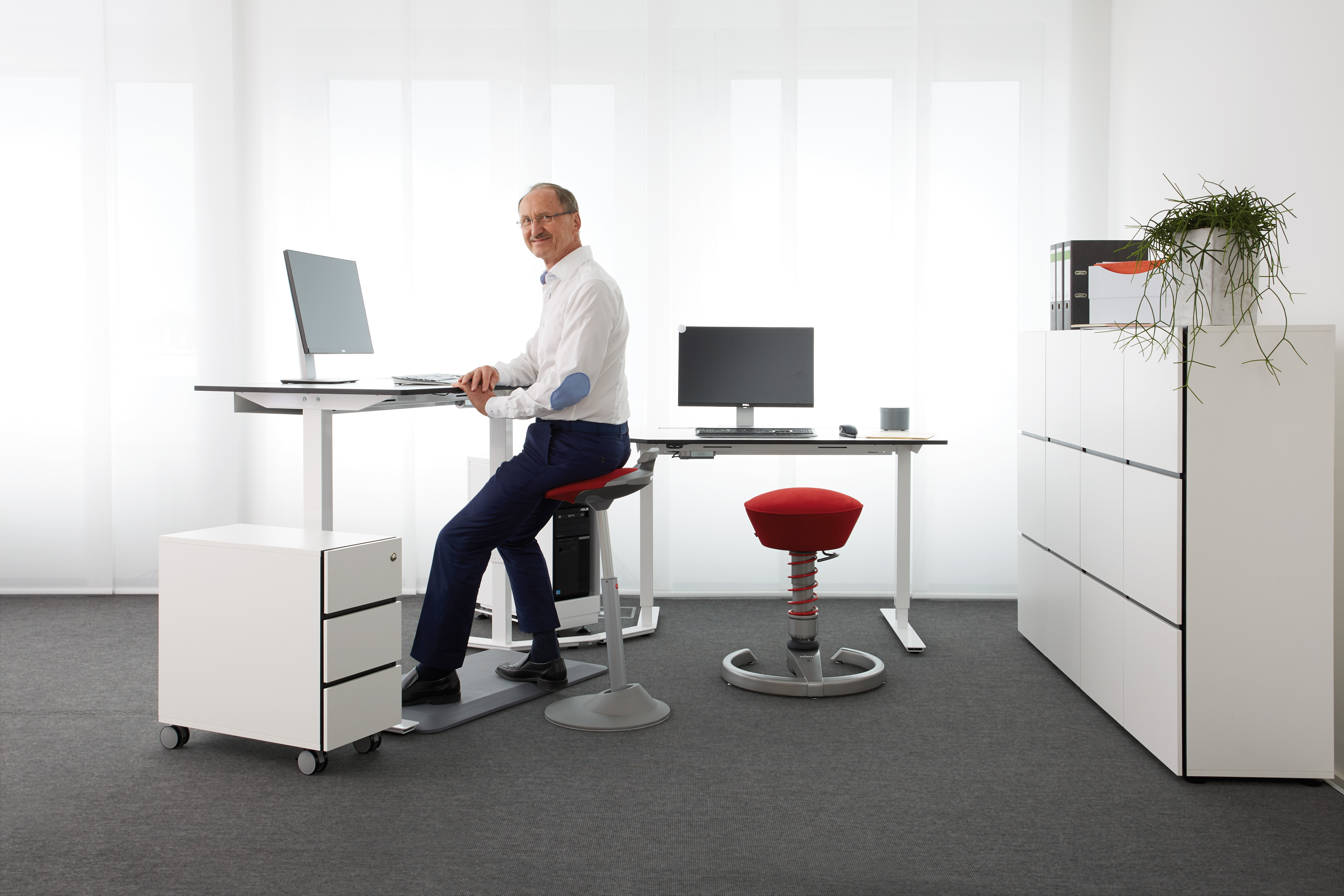 Dynamisches Sitzen, Stehen und ausreichend Bewegung sind im Büroalltag hilfreiche Maßnahmen für einen gesunden Rücken. Auf diese Weise beugen Sie Rückenbeschwerden effektiv vor und durchbrechen den Teufelskreis aus Bewegungsmangel und Verspannungen. Von der AGR zertifizierte Aktiv-Büromöbel wie Aktiv-Bürostühle, höhenverstellbare Schreibtische und optimale Schreibtischarbeitsleuchten unterstützen Ihren Rücken im Büro bestmöglich. Außerdem werden Fehlhaltungen und Gelenkverschleiß verhindert. Achten Sie zudem darauf für ausreichend Bewegung im Büroalltag zu sorgen.