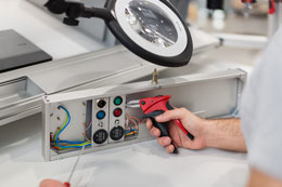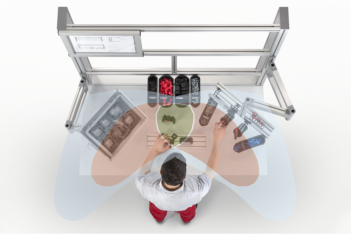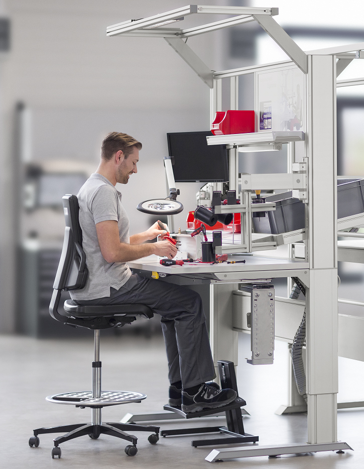 Neben Arbeitsplatzmatte, Werkzeug und einer ergonomischen Sitzmöglichkeit kommt dem Arbeitsplatz selbst eine wichtige Rolle zu. Der Tisch oder besser gesagt das Arbeitstischsystem muss dem Nutzer eine flexible Nutzung im Stehen und Sitzen ermöglichen und fördert so die notwendigen Haltungswechsel – idealerweise durch eine elektrische Höhenverstellung. Module zur Werkzeug- wie zur Materialbereitstellung sorgen außerdem dafür, dass sich alle notwendigen Utensilien in Griffweite befinden. Das steigert die Produktivität und sorgt für einen flüssigen Materialtransport.