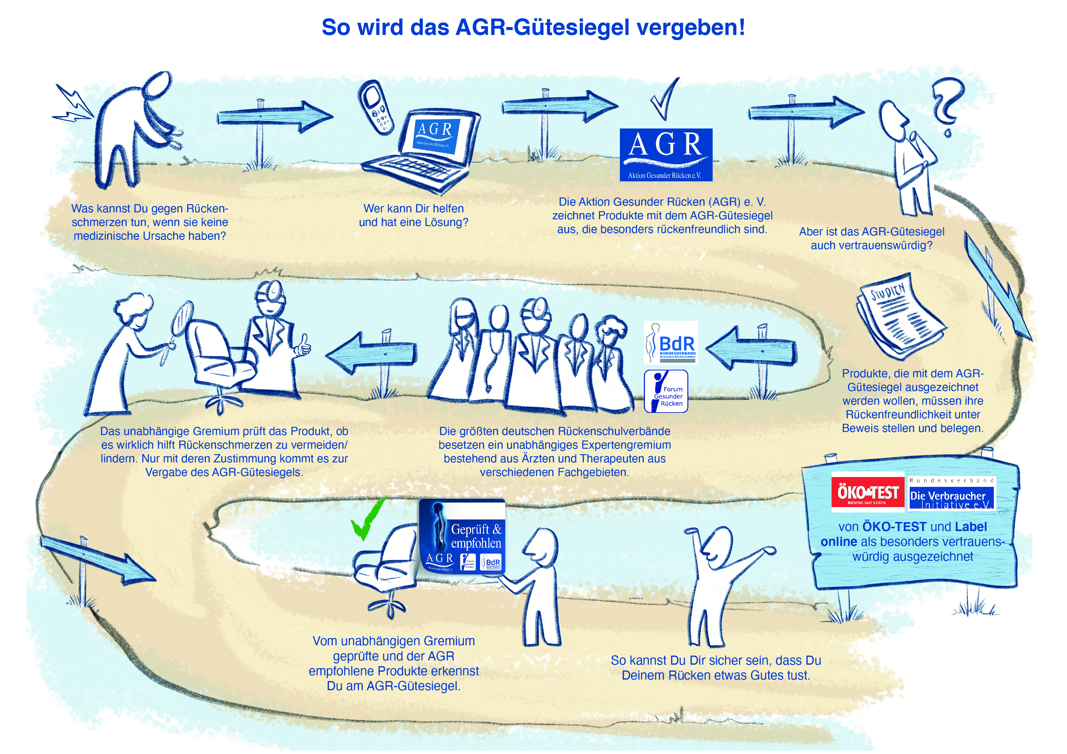 Ob Matratze, Bürostuhl, Kindersitz, Sportgerät oder Ergonomie-Konzept des Arbeitsplatzes – Diese erhalten das AGR-Gütesiegel, wenn sie rückengerecht konstruiert und gestaltet sind. Zudem sollten sie sowohl zur Vorbeugung von Rückenschmerzen als idealerweise auch bei der Therapie von Erkrankungen des Bewegungsapparates unterstützen. Am Anfang steht immer das Herantreten des Unternehmens an die AGR, wenn ein Hersteller das Siegel nutzen möchte. Ein Fragebogen, der online bereitsteht, hilft, die ersten Informationen an die AGR zu übermitteln, denn der Hersteller muss den rückenfreundlichen Nutzen seines Produktes nachweisen. Ist hier alles eingereicht, wird das Produkt geprüft. Das erfolgt nicht durch die AGR, sondern durch ein unabhängiges Experten-Gremium, bestehend aus Ärzten und Therapeuten der medizinischen Fachverbände Forum Gesunder Rücken besser leben e.V. und Bundesverband deutscher Rückenschulen e. V. Die Interdisziplinarität, also das Zusammenwirken unterschiedlicher medizinischer Berufsgruppen, ist hierbei bewusst gewählt. Durch die verschiedenen Betrachtungsweisen auf das zu prüfende Produkt ergibt sich ein umfassendes Prüfergebnis. Die Bewertung der Wirkweise des Produkts erfolgt dabei nicht nach subjektiven Standards, sondern muss vom Hersteller mit Untersuchungen und Studien untermauert werden. Die strengen Prüfkriterien sind es auch, die das Ansehen des AGR-Gütesiegels in der medizinischen Fachwelt ausmachen.