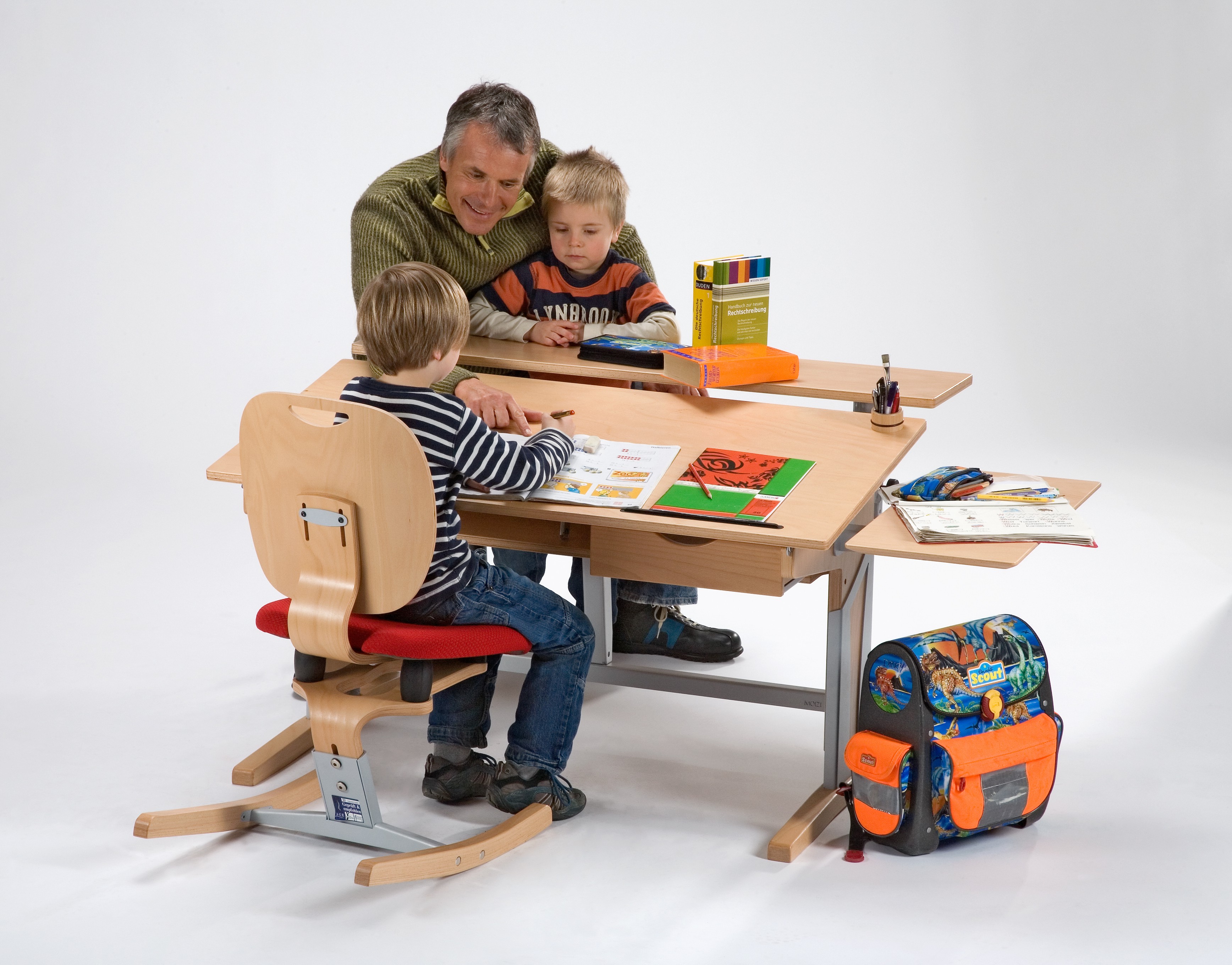 Doch erst das Zusammenspiel von Schreibtisch und Stuhl ermöglicht den Kindern eine gänzlich rückenfreundliche Arbeitsausstattung. Wichtig ist also, dass Stuhl und Schreibtisch aufeinander abgestimmt sind. Nur so bilden sie eine rückengerechte Einheit. Der Stuhl muss dabei über dynamische Eigenschaften verfügen, die die tätigkeitsabhängigen Haltungen des Kindes unterstützen. Das bedeutet, dass sich die Sitzfunktion sowie die Sitzwinkel für die unterschiedlichen Anforderungen einstellen lassen müssen. Dreh- und Angelpunkt ist eine frei fließende Sitzfläche, die ein aktives Sitzen ermöglicht. Durch die ergonomische Formung von Sitz und Lehne entlastet er dabei auch den Rücken und passt sich den Lageveränderungen des Körpers an.