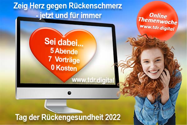 (lifepr) (Bremervörde, 14.02.2022) Zeig Herz gegen Rückenschmerz - jetzt und für immer! Deutlicher und emotionaler kann man seiner Liebe zum Thema Rückengesundheit kaum Ausdruck verleihen. Genau das ist das Motto der diesjährigen Themenwoche des Bundesverbandes deutscher Rückenschulen (BdR) e.V. und der Aktion Gesunder Rücken (AGR) e. V. Vom 14. - 18. März 2022 finden Interessierte wie Betroffene allerlei spannende digitale Inhalte in Workshops und Seminaren. Dabei setzt das Ganze in gewohntem Stil auf ein wissenschaftlich fundiertes, alltagsnahes Maßnahmenpaket zur ganzheitlichen Prävention und Linderung von Rückenschmerzen. Dabei sein ist einfach: Unter www.tdr.digital anmelden und während der gesamten Themenwoche regelmäßige Erinnerungen sowie die tägliche Themenvorschau erhalten und nichts verpassen.