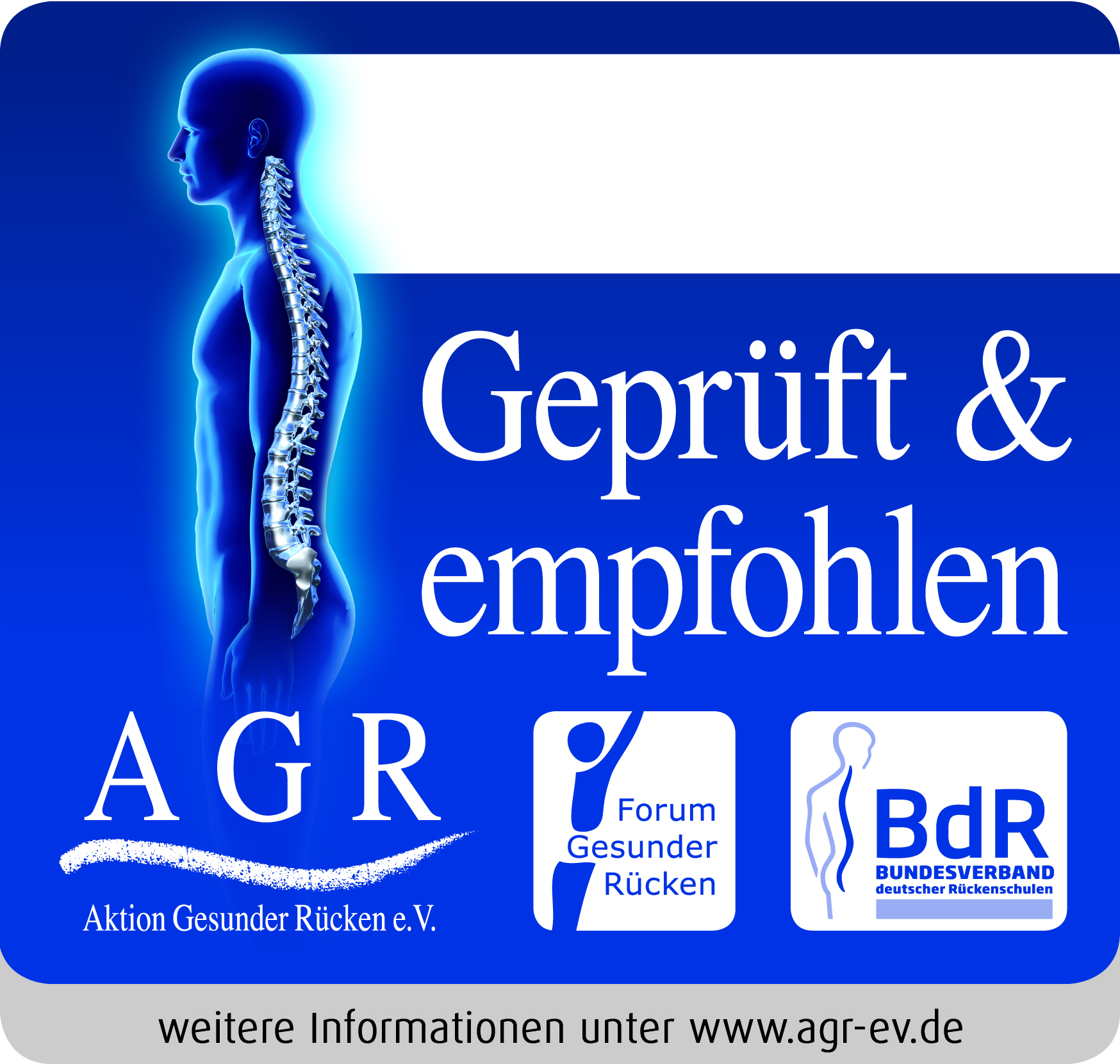 Die Aktion Gesunder Rücken (AGR) e. V. fördert seit ihrer Gründung 1995 die Rückengesundheit. Der unabhängige Verein mit Sitz in Bremervörde (Niedersachsen) zeichnet besonders rückengerechte Produkte in Kooperation mit medizinischen Fachgesellschaften mit dem AGR-Gütesiegel aus. Die Aktion Gesunder Rücken arbeitet eng mit unabhängigen Expertinnen und Experten aus Medizin und Forschung zusammen, um Fachhandel und Therapierende zum Thema Ergonomie und Rückengesundheit zu schulen sowie Verbraucher rund um die Vermeidung von Rückenschmerzen zu informieren.