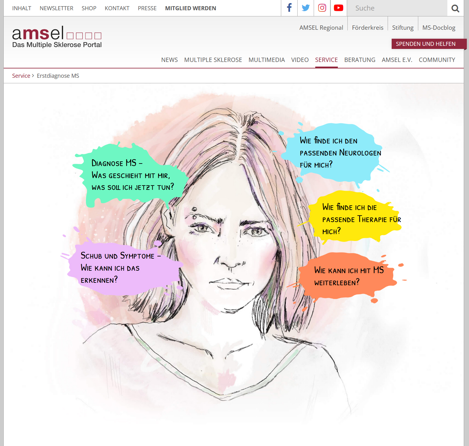 Der neue Wegweiser der AMSEL auf www.amsel.de/erstdiagnose richtet sich an junge und neu an MS Erkrankte, bietet Orientierung mit fundierten, seriösen und unabhängigen Informationen über die MS-Erkrankung, Erfahrungsberichten sowie zahlreichen Tipps, Hinweisen und Links. Die Seite umfasst fünf Themenbereiche: Diagnose MS, Schub und Symptome, der passende Neurologe, die passende Therapie und das Leben mit MS. In jedem Kapitel kommen MS-Erkrankte in Form von Audiodateien zu Wort und berichten von ihren eigenen Erfahrungen nach der Erstdiagnose sowie von Strategien, die ihnen geholfen haben, die Herausforderungen der MS zu meistern. Wer lieber persönlichen Kontakt mit einem Betroffenen und/oder einem psychologischen / psychosozialen Berater sucht, findet unter der angegebenen Telefonnummer 0711 / 697860 direkten Kontakt: unkompliziert, unverbindlich und empathisch – auf Wunsch anonym und in jedem Fall vertraulich.