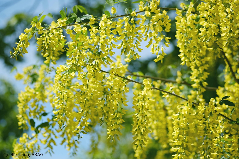Der Gewöhnliche Goldregen (Laburnum anagyroides) ist eine seit langem beliebte, anspruchslose Zierpflanze. Doch die ARAG Experten warnen: Sämtliche Goldregen-Arten enthalten in allen Pflanzenteilen das stark giftige Alkaloid Cytisin. Schon zehn bis fünfzehn Samen können für Kinder tödlich sein. Dabei ist besonders tückisch, dass die Samen Hülsen ausbilden, die Kinder leicht mit Erbsen oder Bohnen verwechseln. Ebenso gefährlich ist die Herbstzeitlose (Colchicum autumnale). Sie blüht von August bis Oktober in verführerischem Rosa oder Lila. Die Blätter erscheinen aber schon im Frühjahr und sind dann dem Bärlauch zum Verwechseln ähnlich. Ihr Gift, das Colchicin, ähnelt Arsen und wirkt bereits in kleinen Mengen von fünf Gramm tödlich.
