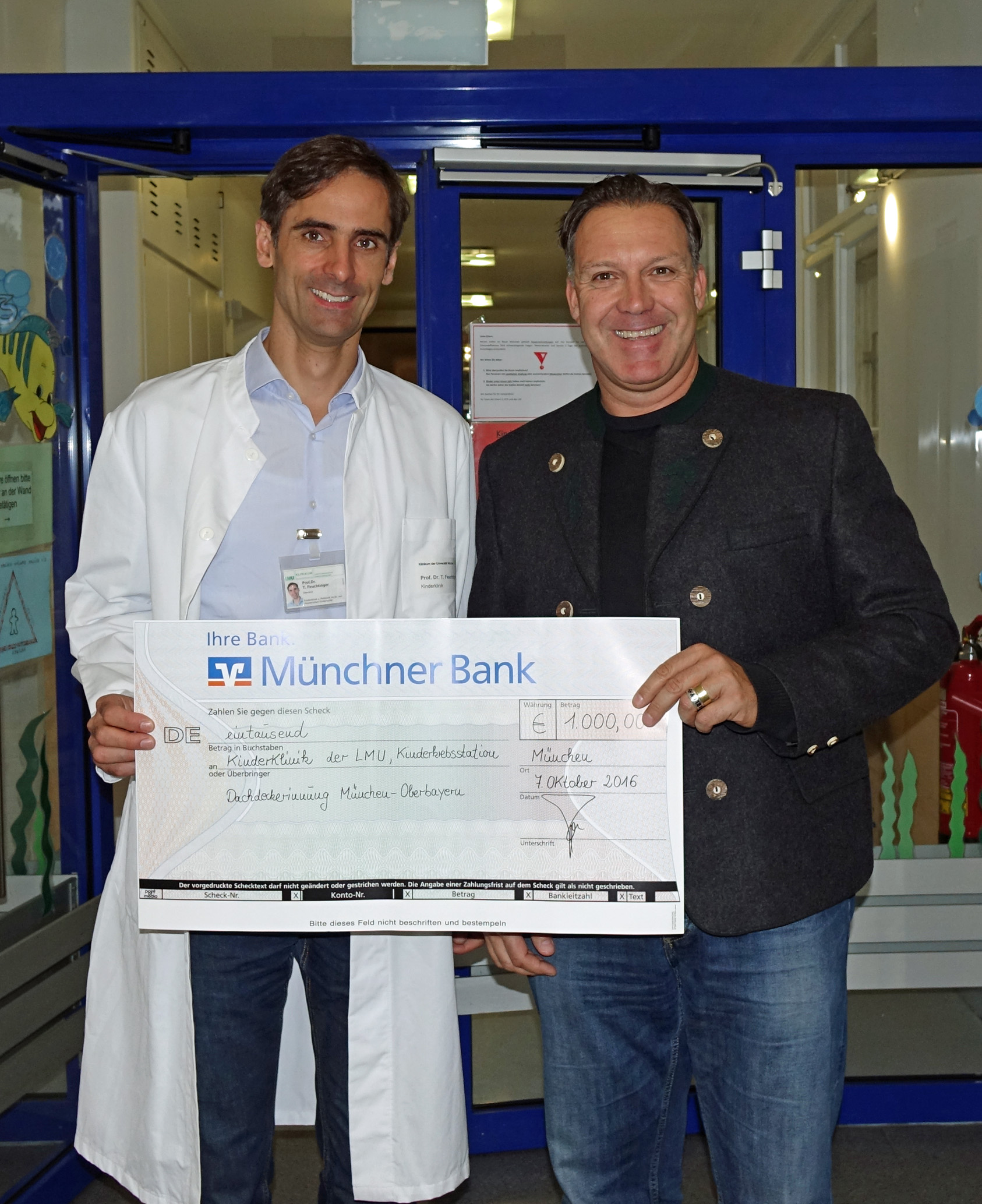 Am Freitag, 7. Oktober, überreichte Josef Frank, Obermeister der Dachdecker-Innung (Foto re.) den symbolischen Scheck an Prof. Feuchtinger (li.): „Solch eine Spende ist nicht ein Tropfen auf den heißen Stein, sondern ein wichtiger Beitrag, den Kindern in ihrer schweren Zeit auf unserer Station ein Lächeln auf das Gesicht zu zaubern“.