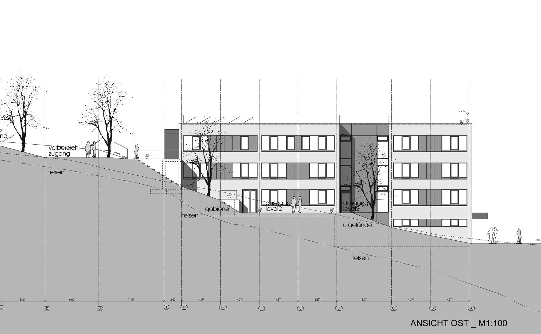Parallel dazu wurde das Flachdach weitgehend fertiggestellt und die vorgehängte hinterlüftete Fassadenbekleidung montiert. Nun gingen Maler und Schreiner ans Werk. Die Ausschreibungen für Schließtechnik, Baureinigung, Beschilderung, Möblierung, IT-Technik und Außenanlagen erfolgten.
