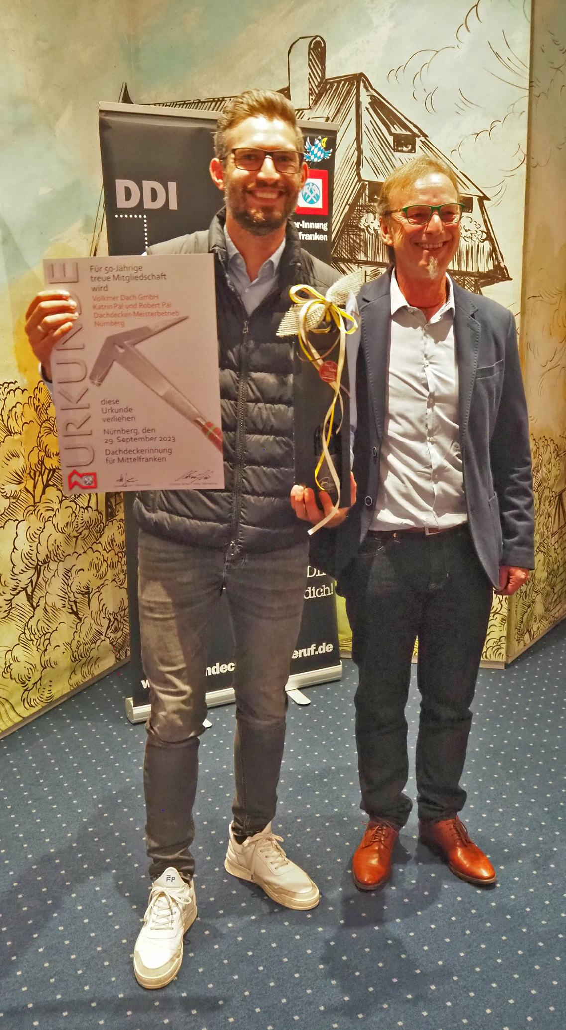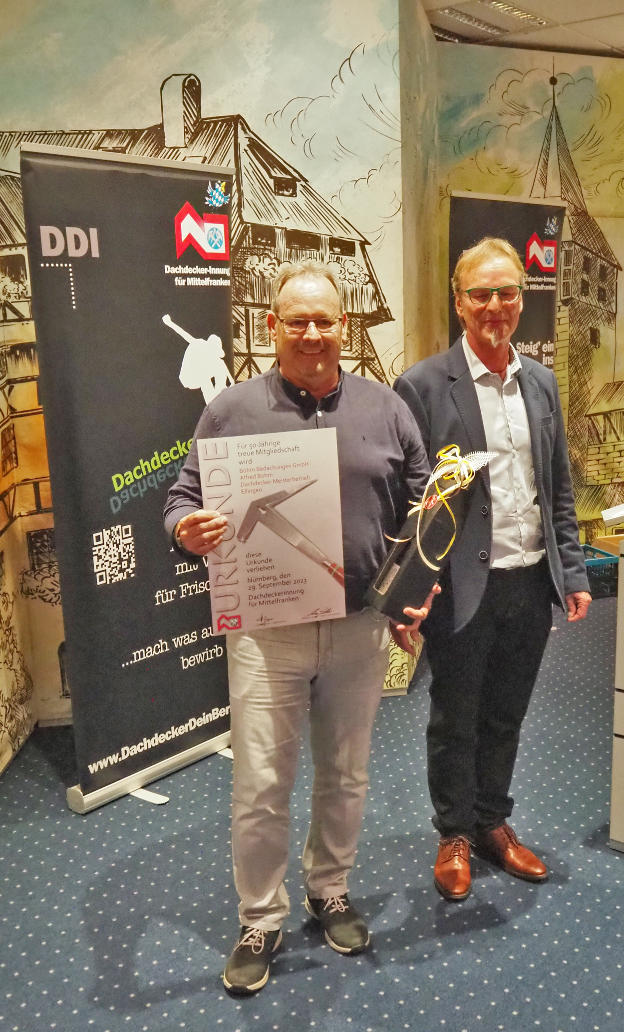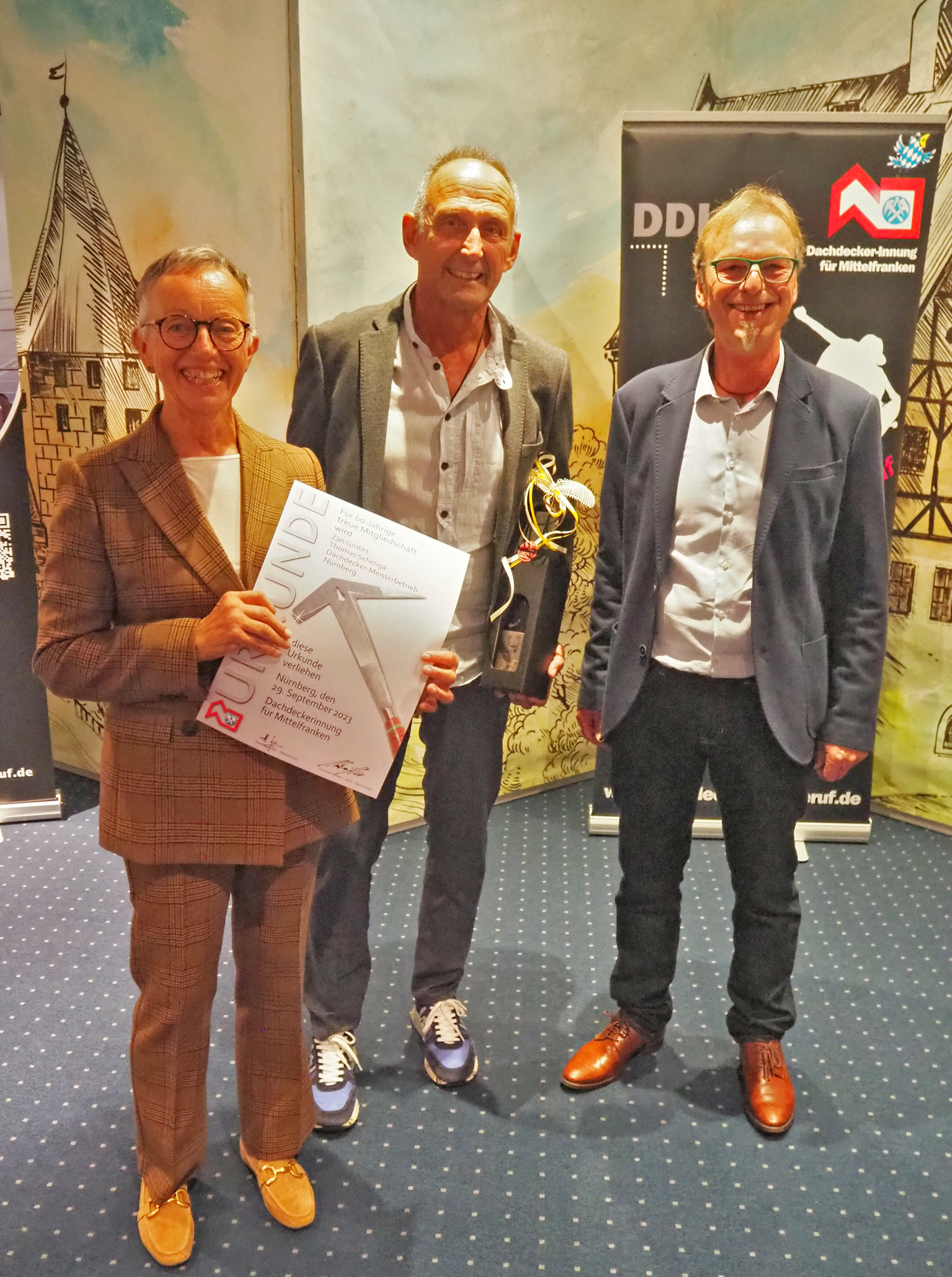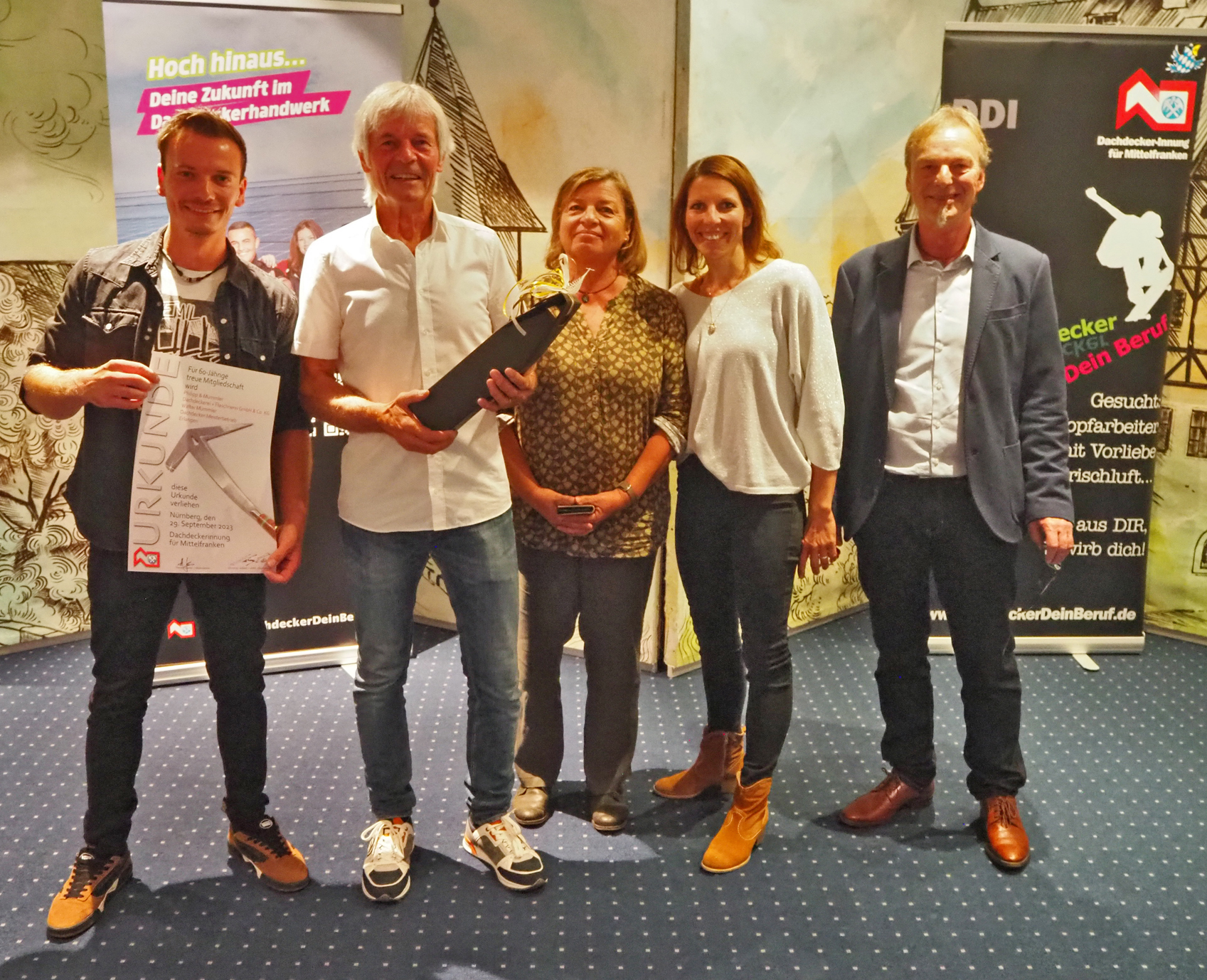 Auch die Mitgliedschaft in der Dachdecker-Innung hat für viele Dachdeckerbetriebe Mittelfrankens schon eine lange Tradition. So wurde eine Ehrung zuteil: