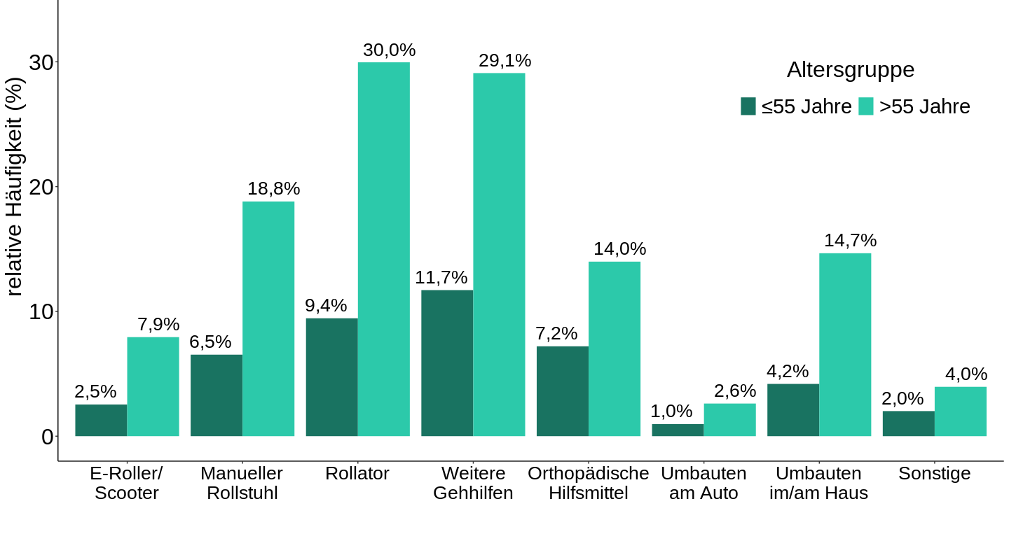 Abbildung 3: Häufigkeit der Verwendung einzelner Hilfsmittel unterteilt nach Altersgruppen. Die farblichen Säulen stellendie jeweilige Hilfsmittelkategorie dar. Die Verwendung des Hilfsmittels bezieht sich auf den gesamten Krankheitsverlauf und muss nicht zwangsläufig zum Zeitpunkt der letzten Visite erfolgt sein. Mehrfachnennungen pro MS-Erkrankten sind möglich.