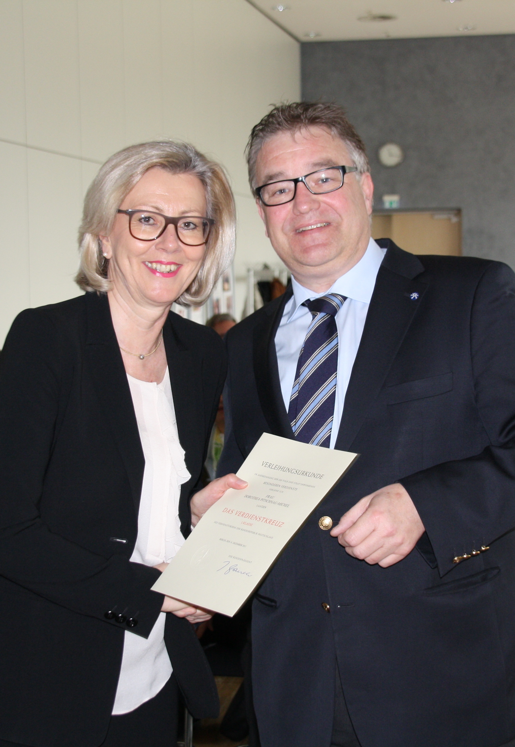 Regionspräsident Hauke Jagau überreicht DMSG-Bundesgeschäftsführerin Dorothea Pitschnau-Michel die Urkunde zum Bundesverdienstkreuz