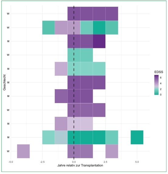 Abbildung 3: Verlauf des Behinderungsgrads anhand des EDSS-Wertes bei MS-Erkrankten relativ zur aHSZT. Die vertikale schwarze Linie (Jahr 0) markiert den Zeitpunkt der Transplantation. Das Geschlecht der MS- Erkrankten wird als (M = männlich, W = weiblich) dargestellt. Die Balken zeigen die Entwicklung des EDSS-Wertes über die Jahre vor und nach Transplantation. Negative Werte zeigen die Zeit vor der Transplantation, positives Werte die Zeit danach. Die Farbcodierung spiegelt die Höhe des EDSS-W