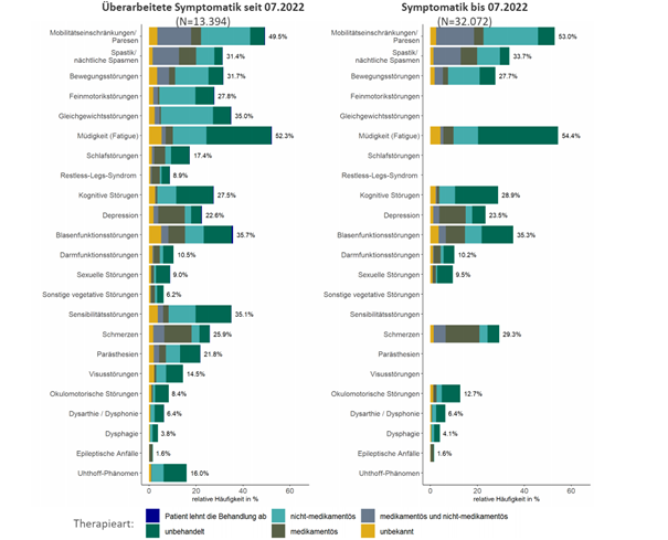 Abbildung 1: Vergleich der MS-Symptomatik vor und nach der Überarbeitung in der Forschungsdatenbank des MS-Registers. Die Prozentwerte geben den Anteil an, bei denen das jeweilige Symptom vorhanden war. Die farblichen Balken stellen den jeweiligen Anteil der angewendeten Therapieformen dar.
