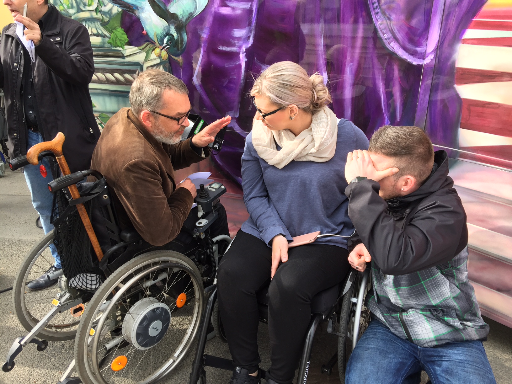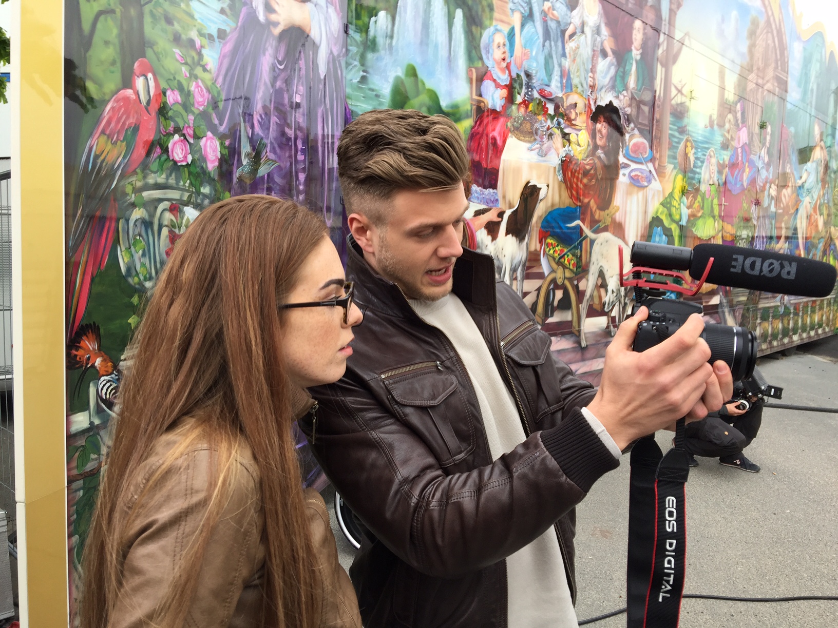 Der Regisseur Maik Lüdemann informiert Hauptdarstellerin Anika Schreiber vor dem Dreh der nächsten Szene.
