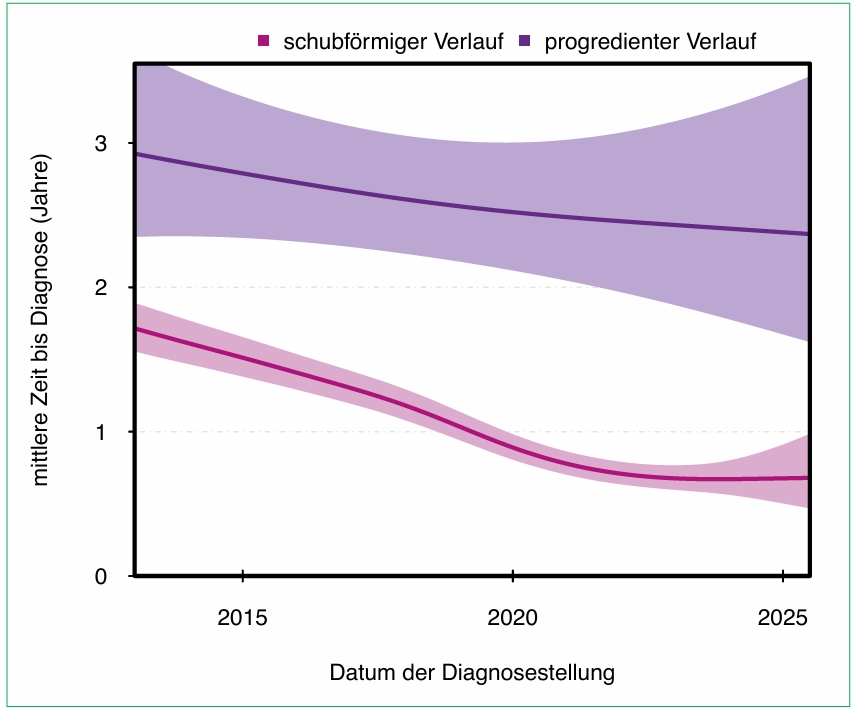 Abbildung 1: Darstellung der mittleren Zeit bis zur Diagnose bei MS-Erkrankten im MS-Register über die letzten 11 Kalenderjahre.