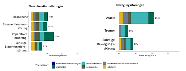 Abbildung 2: Prozentuale Häufigkeiten der Unterkategorien der Symptome Blasenfunktions- und Bewegungsstörungen. Die farblichen Balken stellen den jeweiligen Anteil der angewendeten Therapieformen dar.