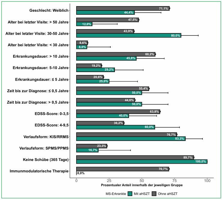Abbildung 1: Klinische Merkmale im Gruppenvergleich zwischen Patienten mit und ohne aHSZT zum Zeitpunkt der letzten Visite. Angegeben sind die prozentualen Anteile innerhalb der jeweiligen Gruppe. Die Linien hinter den Balken zeigen das obere 95% Clopper Pearson Intervall als Maß der statistischen Sicherheit.