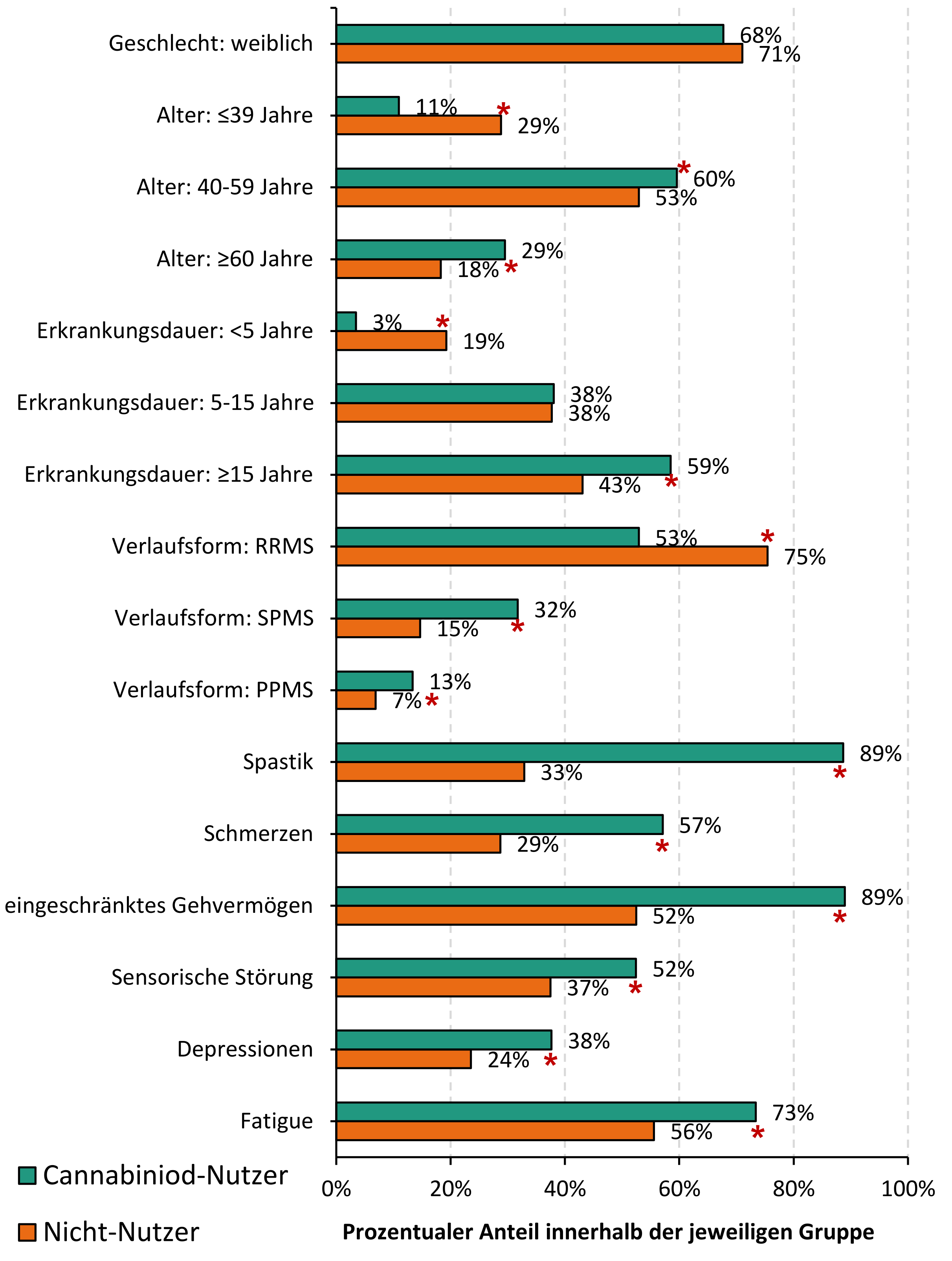 Abbildung 1: Vergleich der Sativex-Nutzer (N=359, ohne off-label) und derer, die keine Cannabis-Produkte nutzen (N=29.563) hinsichtlich Demografie, Verlaufsform und Symptomatik bei der letzten dokumentierten Visite im MS-Register. MS – Multiple Sklerose; PPMS – Primär progrediente MS; RRMS – Schubförmig remittierende MS; SPMS – Sekundär progrediente MS; (*) – p-Wert ≤ 0,05.