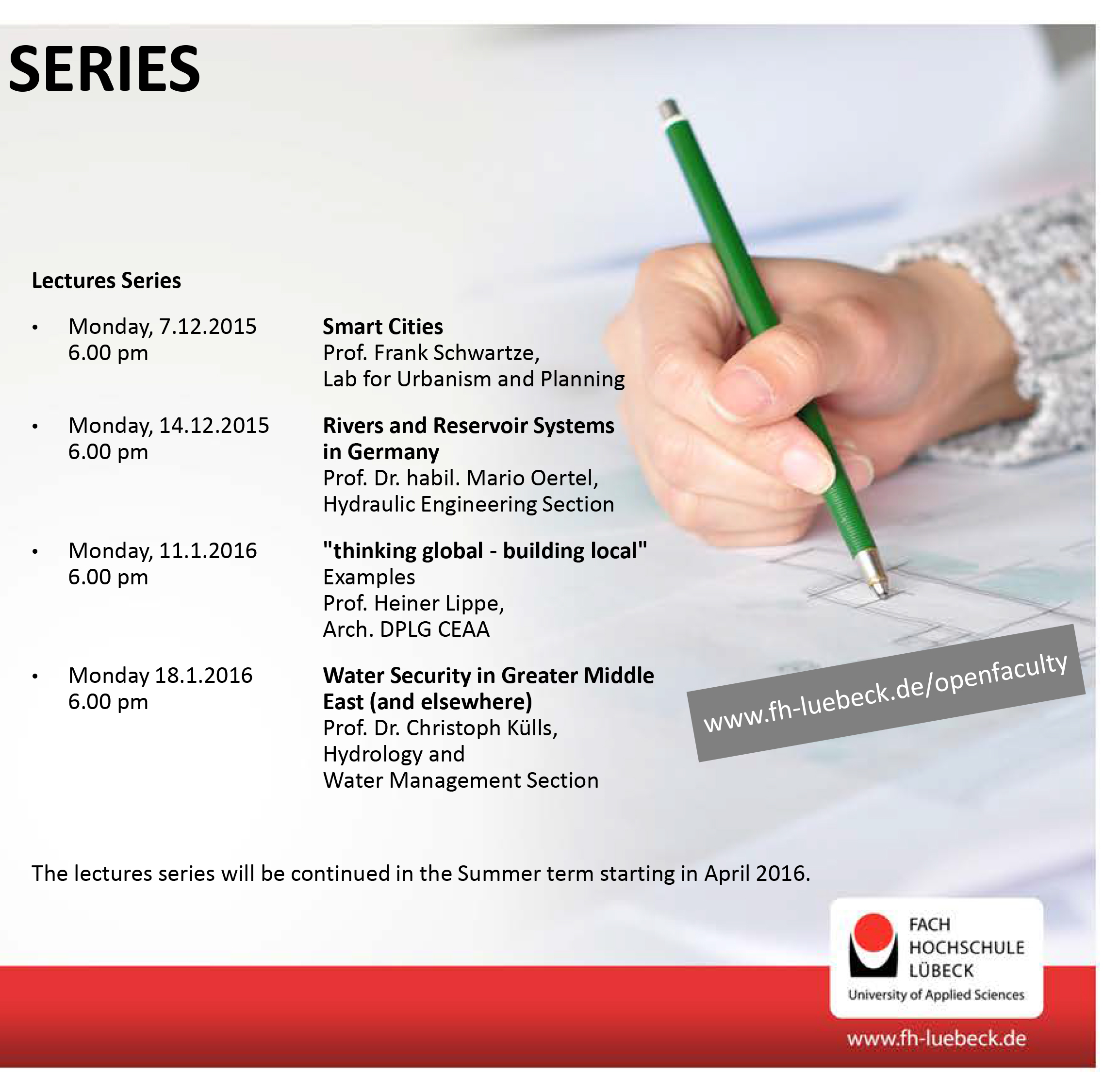 Der Fachbereich Bauwesen bietet diese Ringvorlesung „Open Faculty“ für Flüchtlinge, Studierende und alle weiteren interessierten Personen an. Im Rahmen der Ringvorlesung werden unterschiedliche Themen aus den Bereichen Architektur, Bauingenieurwesen und Städtebau in Form von Vorlesungen, Workshops sowie Kurzexkursionen angeboten. Es ist ein offenes Angebot für alle Interessierten - Studierende in Lübeck, Flüchtlinge mit akademischen Hintergrund oder Studieninteresse und alle weiteren Fachleute sowie Bürger und Bürgerinnen. Die Ringvorlesung will ein Forum für einen fachlichen Austausch bieten und Einblicke in das akademische Leben an der Fachhochschule Lübeck ermöglichen.