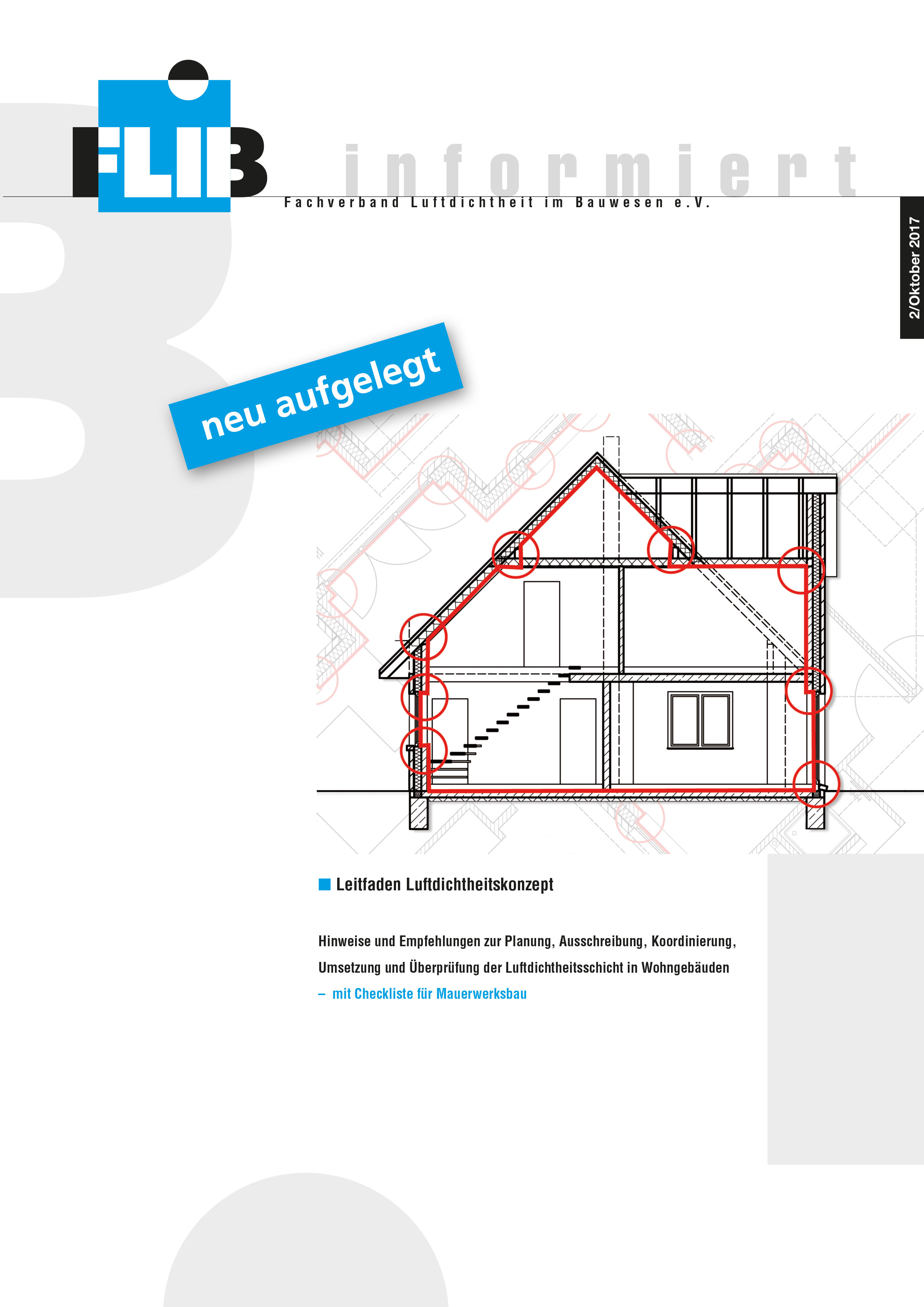 Auch Leitfaden neu aufgelegt: In der zweiten, überarbeiteten Ausgabe des FLiB-Folders „Leitfaden Luftdichtheitskonzept mit Checkliste für Mauerwerksbau“ unterteilt der Fachverband das Luftdichtheitskonzept jetzt in Grobkonzept und Detailplanung. Die entsprechend geänderte Version steht ab sofort unter www.flib.de und www.luftdicht.info zum Download bereit und kann dort in größerer Stückzahl auch als Druckfassung bestellt werden. Zusätzlich liegt jetzt eine eigene Broschüre vor, die sich ausschließlich mit dem Grobkonzept einer Luftdichtheitsplanung befasst. Grafik: FLiB e.V., Abdruck bei Quellenangabe honorarfrei. Belegexemplar erbeten.