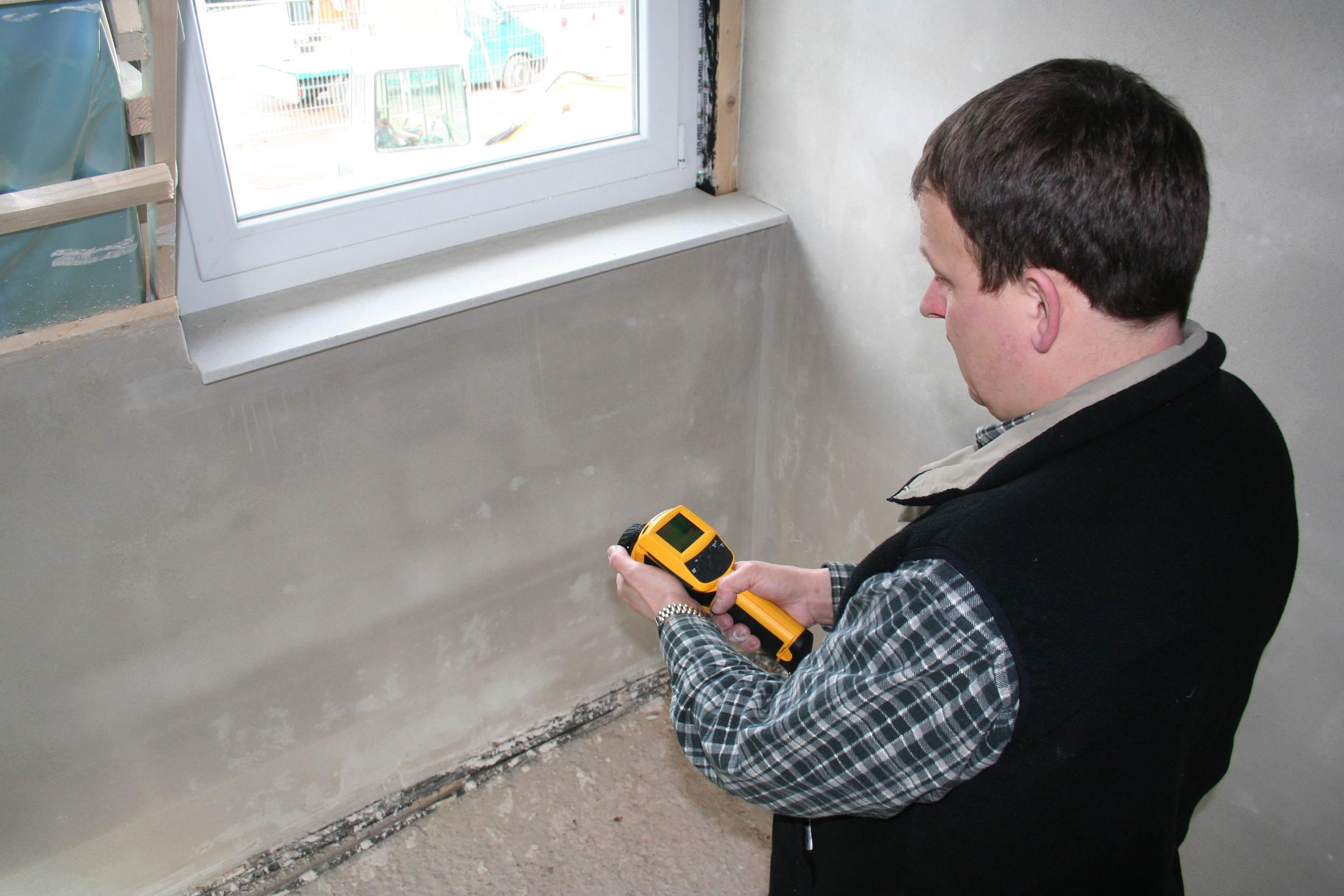 Leckagesuche ist Pflicht: Die für Luftdurchlässigkeitsmessungen relevante Norm schreibt die Suche nach größeren Fehlstellen verbindlich vor. Wer sich nicht nur für die Luftdichtheit des gesamten Gebäudes interessiert, sondern tiefer gehende Aussagen über einzelne Bauteile oder Bauteilschichten treffen will, sollte die Fahndung auch auf kleinere Luftlecks ausweiten. Als technische Hilfsmittel können dabei Thermo-Anemometer (im Bild), Rauch oder Wärmebildkameras zum Einsatz kommen. Foto: FLiB e. V. Abdruck bei Quellenangabe honorarfrei, Belegexemplar erbeten.