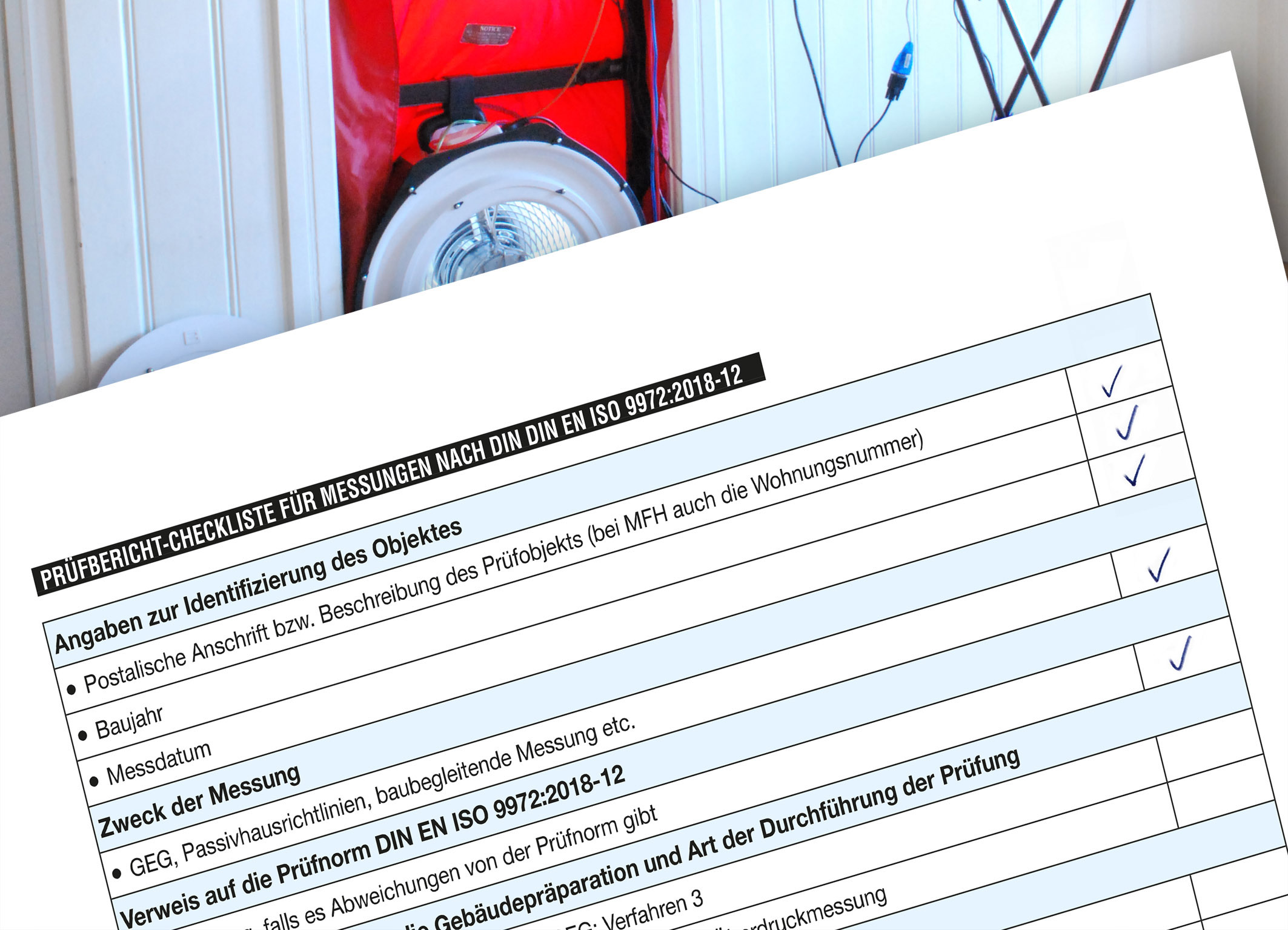 Alles erledigt, alles korrekt? Die Checklisten in der frisch aufgelegten FLiB-Broschüre helfen bei der Arbeit mit der neuen Prüfnorm für Luftdichtheitsmessungen. Abbildung: FLiB e.V. Veröffentlichung bei Quellenangabe honorarfrei. Belegexemplar erbeten.