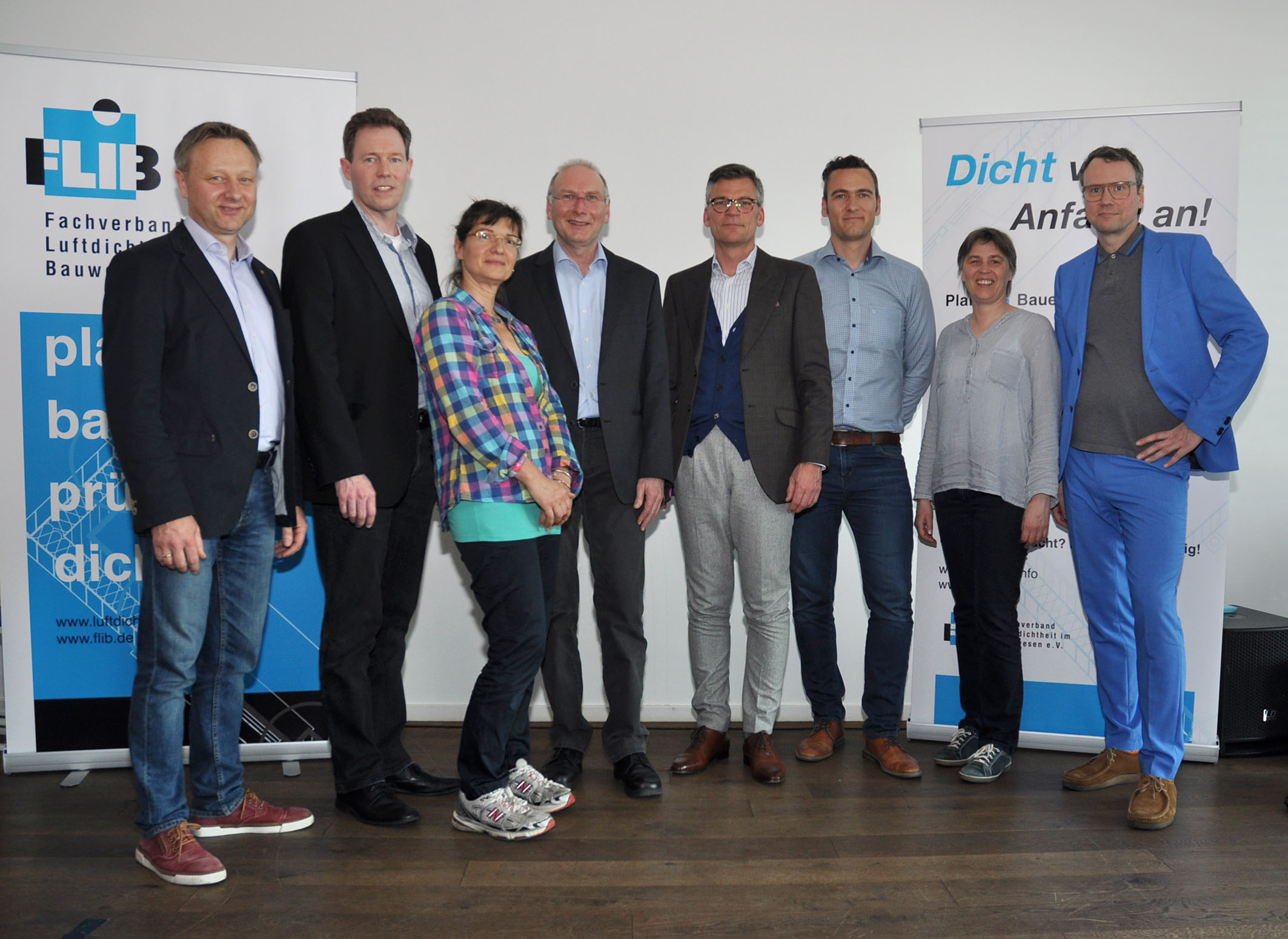 Achtfaches Engagement für die luftdichte Gebäudehülle: der stellvertretende Vorsitzende des Fachverbands Luftdichtheit im Bauwesen e. V., Johannes Lötfering, Rüdiger Specht, Sabine Gülker, Wilfried Walther als Verbandsvorsitzender, die beiden Neuen im Gremium, Jan Helge Schröder und Stefan Hückstädt, sowie Stefanie Rolfsmeier und FLiB-Geschäftsführer Oliver Solcher (von links nach rechts) / Foto: FLiB e.V.