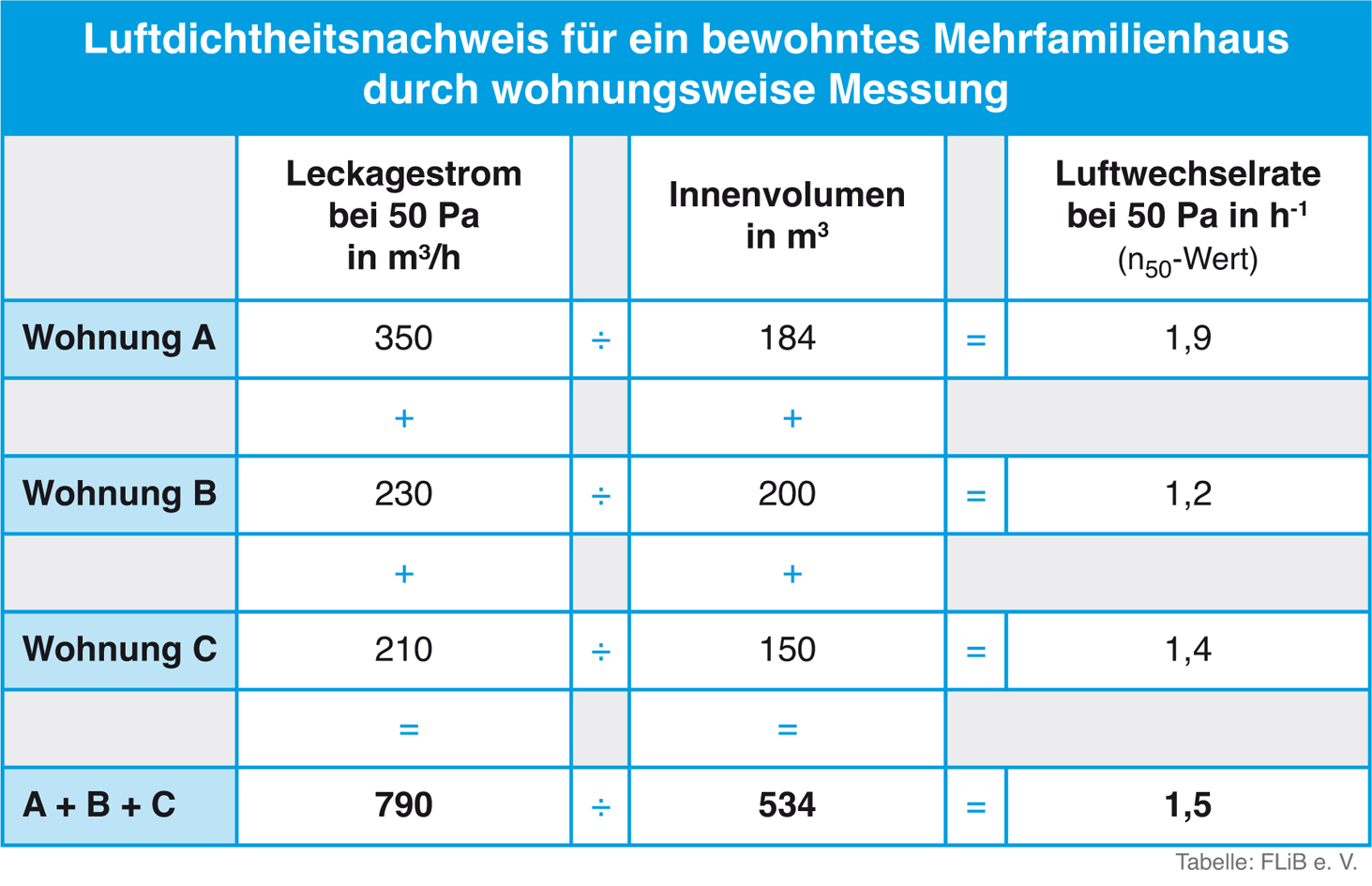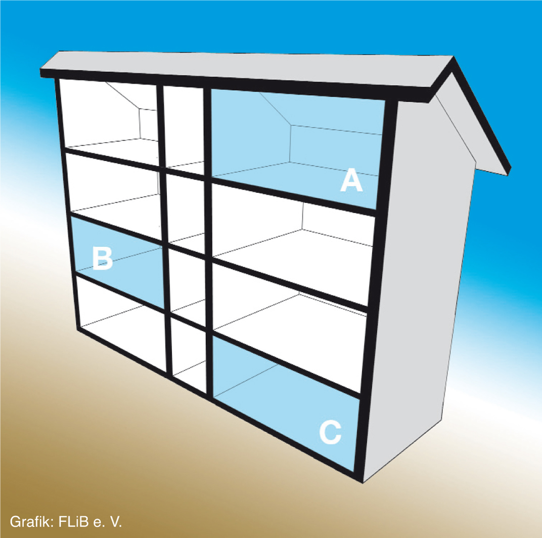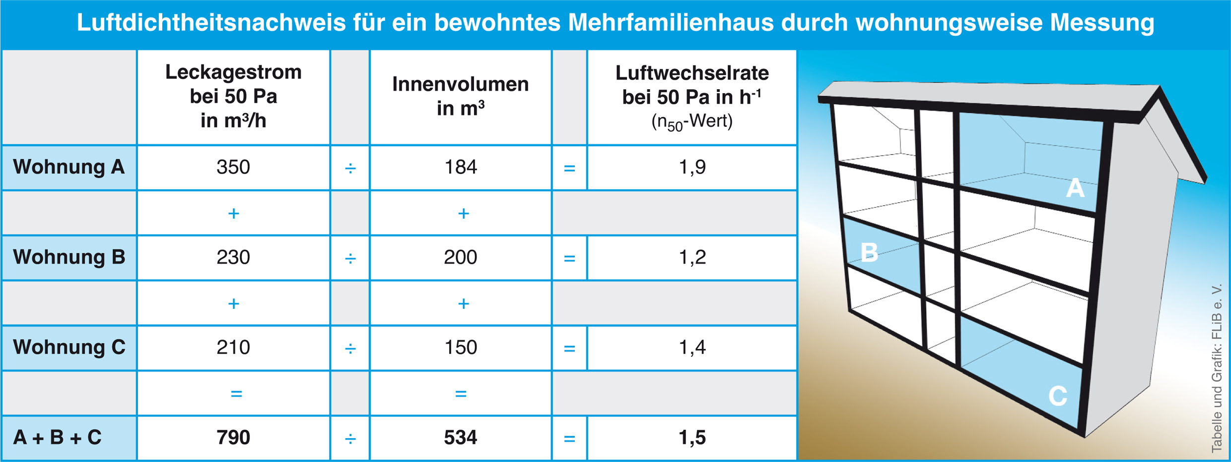 Kann nach einer Sanierung in einem bewohnten Mehrfamilienhaus dessen Luftdichtheit nicht mit einer Gesamtmessung ermittelt werden, ist alternativ eine wohnungsweise Messung möglich. Dafür überprüft man mindestens jeweils eine Wohneinheit im Dach- bzw. Ober-, Mittel- und Untergeschoss, auf jeden Fall aber 20 Prozent aller Wohnungen. Mehr als zwölf Wohneinheiten braucht man nicht zu messen. Beispiel: Die Summe der Innenvolumina von Wohnung A im Dachgeschoss , Wohnung B im ersten Stock sowie der Erdgeschosswohnung C beträgt 534 Kubikmeter, die Summe der in den drei Wohnungen ermittelten Volumenströme ergibt einen Luftaustausch von 790 Kubikmetern pro Stunde. Setzt man beide Werte ins Verhältnis, ergibt sich eine Luftwechselrate von 1,5 je Stunde. Damit wird die für Gebäude mit Lüftungsanlagen verbindliche EnEV-Vorgabe eingehalten. Grafik: FLiB e. V. Abdruck bei Quellenangabe honorarfrei. Belegexemplar erbeten.