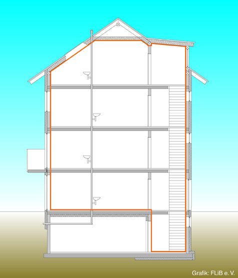 Lässt sich die luftdichte Hülle des beheizten Volumens vollständig mit einem Stift umfahren? Dieser Test ist nur ein kleiner Schritt beim Erstellen eines Luftdichtheitskonzepts. Die DIN 4108, Teil 7, gibt einen guten Überblick über das, was in eine solche Ausarbeitung gehört und worauf man auf dem Weg zur dauerhaft luftdichten Gebäudehülle besonders achten sollte. Grafik: FLiB e.V. Abdruck bei Quellenangabe honorarfrei. Belegexemplar erbeten.