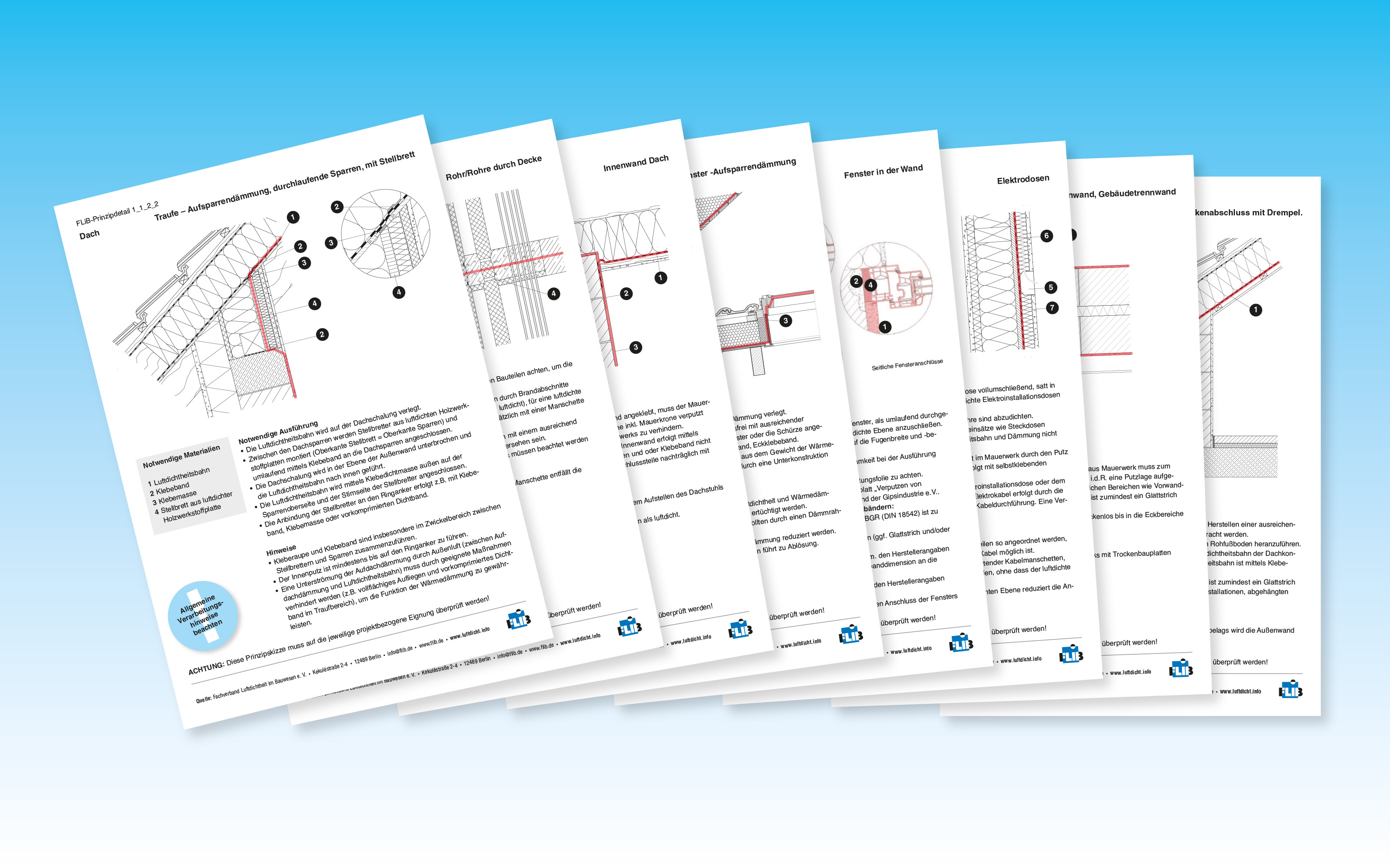 Stapelweise Antworten: Die neue FLiB-Datenbank informiert praxisgerecht über Planung und Umsetzung luftdichter Details. Vielfach kann man die herstellerneutralen Skizzen direkt in ein Luftdichtheitskonzept einbinden / Grafik: FLiB e.V.