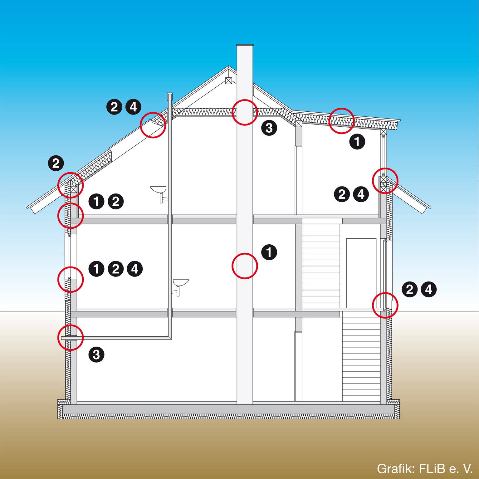 Häufige Problemstellen der Gebäude-Luftdichtheit nach räumlicher Zuordnung: Bauteilflächen (1), Übergänge zwischen Bauteilen bzw. Bauteilanschlüssen (2), Durchdringungen (3) und Funktionsfugen (4). Die Grafik steht beispielhaft für eine Serie bildlicher Darstellungen rund um das Thema Luftdichtheit, um die der Fachverband Luftdichtheit im Bauwesen e. V. seinen Internetauftritt kürzlich erweitert hat. Auch Antworten auf weitere FAQs sind hinzugekommen (www.flib.de, „Zum Thema“ oder Direktlink www.faqs.flib.de).