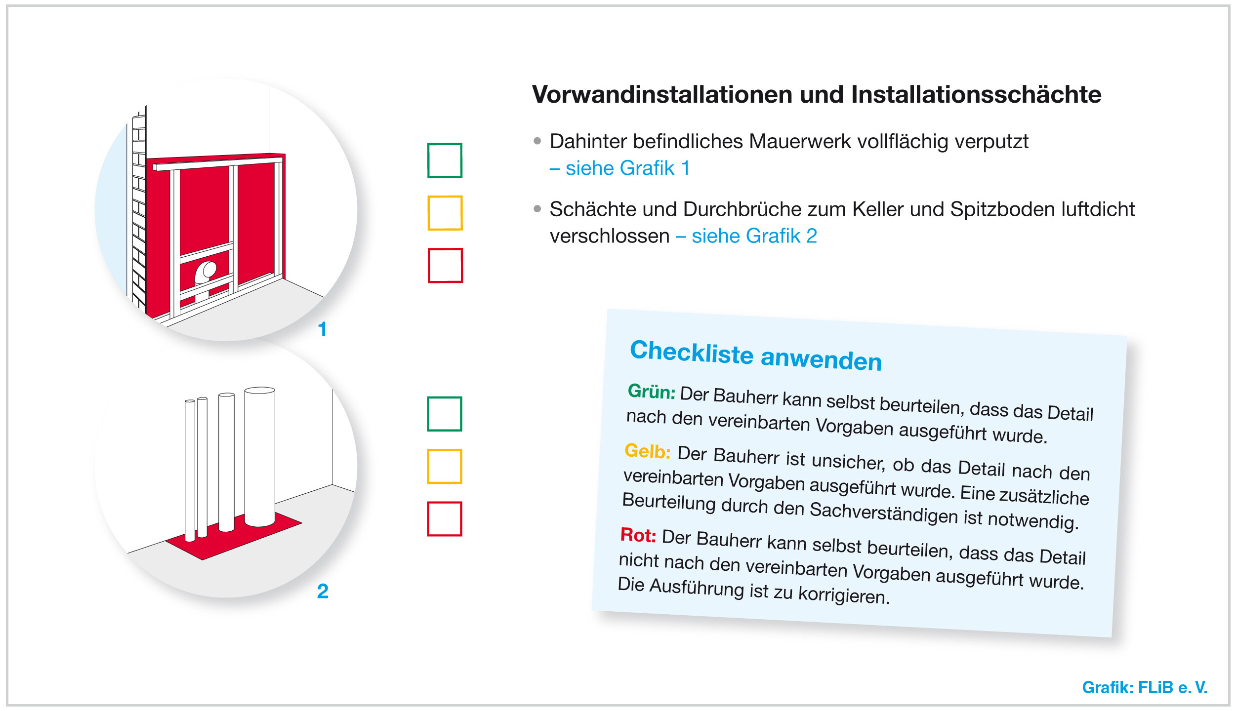Rot, Gelb oder Grün? Das Ampelsystem der neuen FLiB-Checkliste für Mauerwerksbau leitet Bauherren bei der Entscheidung: Können sie selbst die Ausführung eines luftdichten Details als korrekt oder fehlerhaft einstufen oder sollten sie besser den baubegleitenden Sachverständigen fragen? Grafik: FLiB e.V. Abdruck bei Quellenangabe honorarfrei. Belegexemplar erbeten.