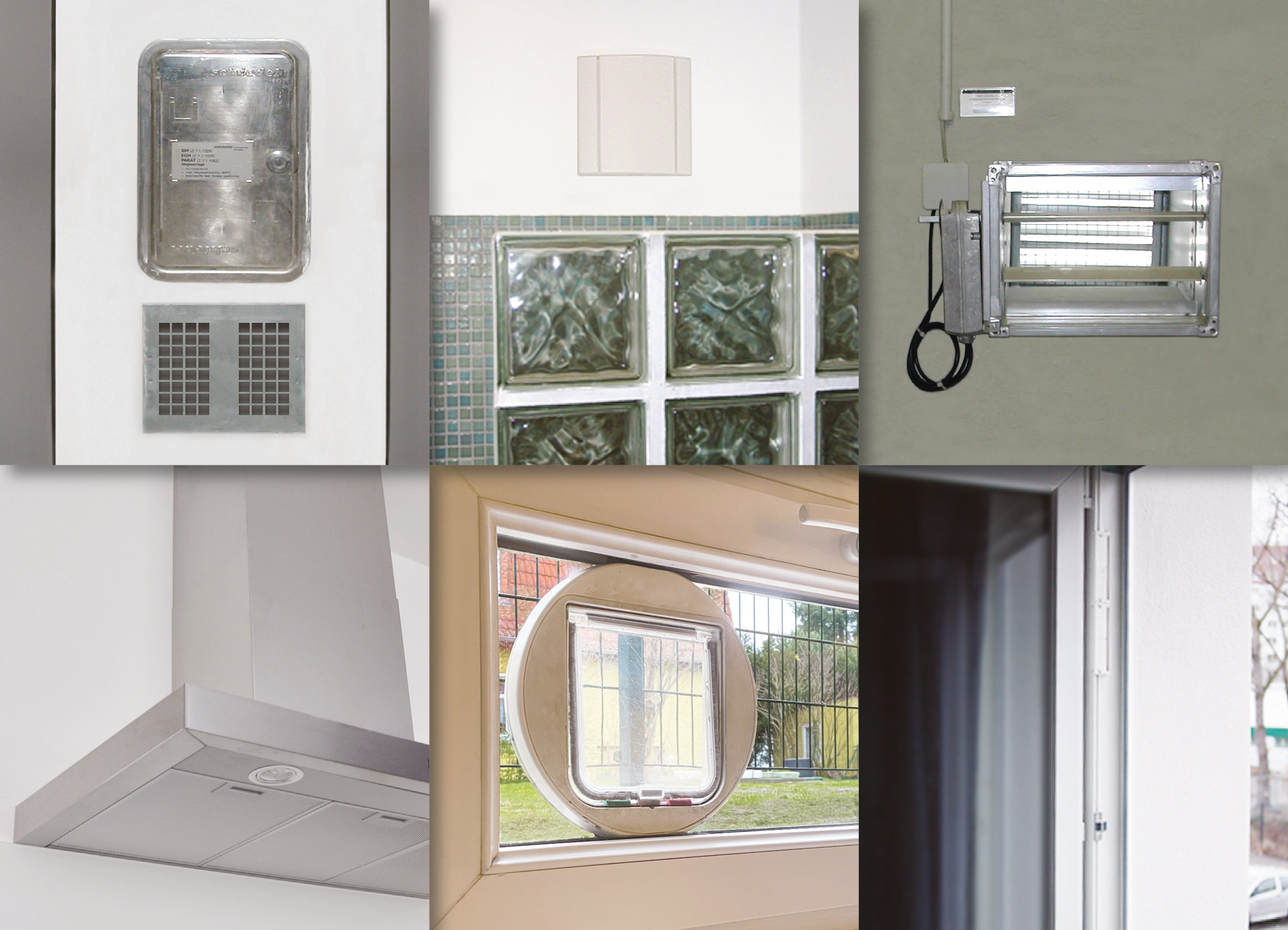 Abdichten – nein danke: Kaminhinterlüftung, Abluftöffnung im fensterlosen Bad, Fahrschachtbelüftung, Ablufthaube, Katzenklappe und ein der freien Lüftung dienender Fenster¬falzlüfter (von oben links nach unten rechts) sind Beispiele von Öffnungen in der Gebäudehülle, die man für GEG-Schluss¬messungen nicht abdichten darf.