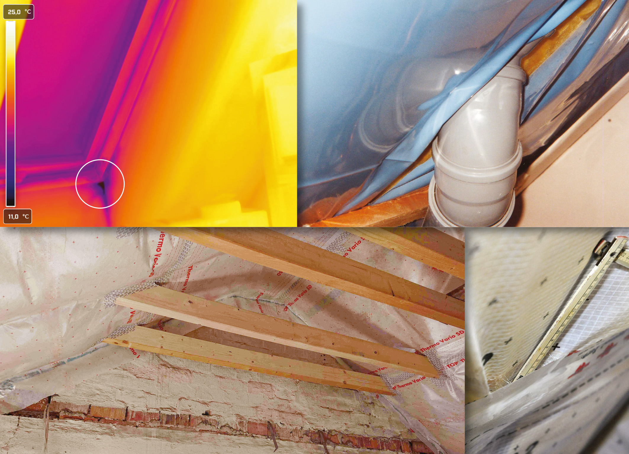Beispiele häufiger Luft-Leckagen: Undicht eingebautes Dachflächenfenster, Rohrdurchdringung komplett ohne Andichtung, unverputzt gebliebene Giebelwand und abgelöste Folienverklebung (von oben links nach unten rechts).