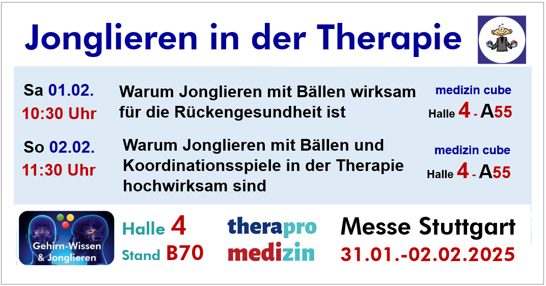 (lifepr) (München, 12.01.2025) Durch die Kombination der Messen „medizin und „therapro“ ist dies eine der wichtigsten Fach- und Fortbildungsveranstaltungen der Gesundheitsbranche bzw. Mediziner und Experten aus der Physiotherapie, Ergotherapie, Logopädie und Massage. Auf der Messe Stuttgart kann man die neuesten Trends und Produkte der Branche vom 31. Januar bis zum 02. Februar 2025 entdecken. Ob Fachmesse, Kongress, Seminare oder Workshops – zahlreiche Veranstaltungen laden zu Austausch und Fortbildung ein. Mit dabei aus München ist dieses Jahr auch wieder Stephan Ehlers, Experte für Gehirn-Wissen und Jonglieren. An seinem Messestand „GEHIRN-WISSEN & JONGLIEREN“ in Halle 4, Stand B70 können Messebesucher normale und schwere Jonglierbälle sowie verschiedene Spiele für Koordination und Kognition ausprobieren. Seine Vorträge in diesem Jahr: