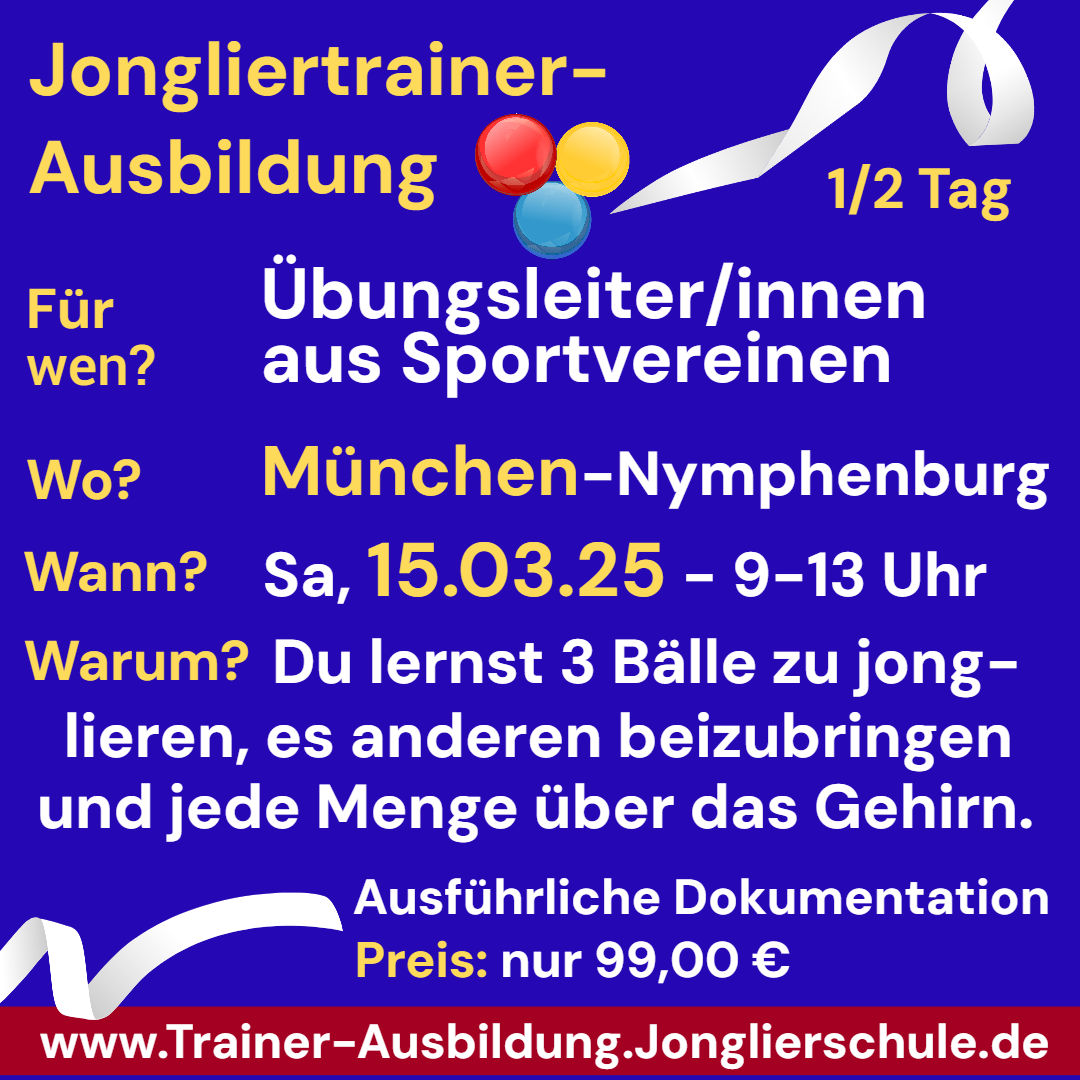 (lifepr) (München, 23.01.2025) Übungsleiter/innen bzw. Trainer/innen aus Sportvereinen haben am Samstag, den 15. März 2025 die Gelegenheit, sich in nur einem halben Tag zum Jongliertrainer ausbilden zu lassen. Die Ausbildung findet in der Jonglierschule München (Nymphenburg) statt, bei Stephan Ehlers Deutschlands erfolgreichstem Jongliertrainer und 4-fachen Weltrekordinhaber im Jonglieren-Lernen statt. Die Teilnahme kostet nur 99,00 € inkl. Zertifikat und ausführlicher (!) Dokumentation. Weitere Info + Anmeldung: www.Trainer-Ausbildung.Jonglierschule.de