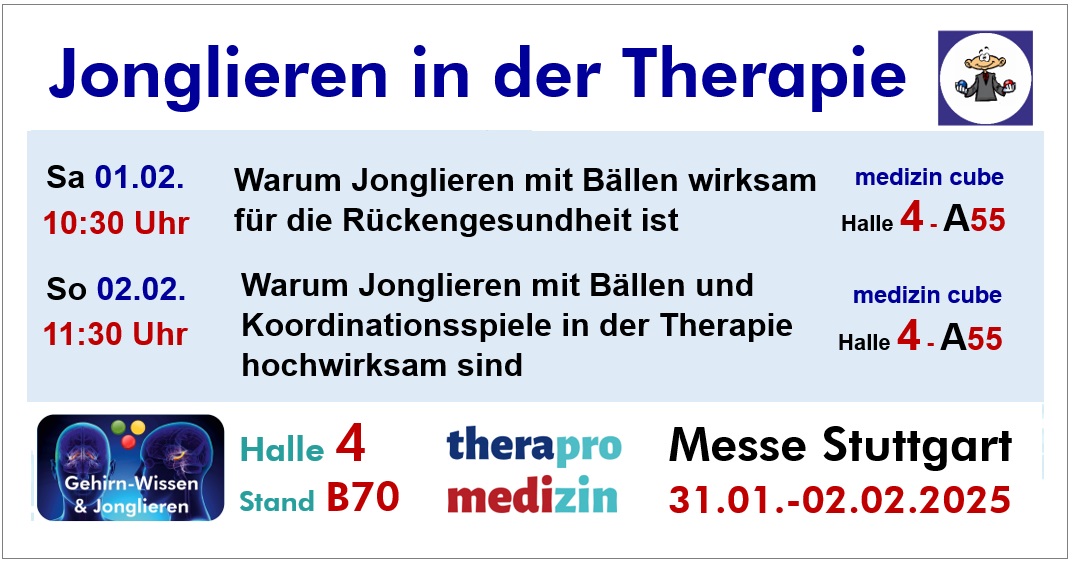 Am Messestand Gehirn-Wissen & Jonglieren in Halle 4 / B70 wird Stephan Ehlers den Messebesuchern erklären und sie selbst erleben lassen, warum das Jonglieren bzw. Wurf-/Fangübungen mit nur einem Ball bereits intensiv im Gehirn wirkt und Kognition und Koordination verbessern. Außerdem wird erklärt, wie Gesundheitsberufe DX-Powerpowerbälle wirksam für REHA und in der Therapie einsetzen können. Außerdem werden zwei Vorträge angeboten: