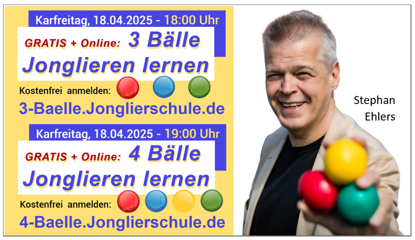 (lifepr) (München, 17.04.2025) Wer denkt, Jonglieren sei nur was für Zirkusartisten oder Freizeitclowns, der hat den „Tag der Jongleure“ noch nicht gefeiert! Am 18. April ist es wieder soweit: Deutschlands größte Online-Akademie fürs Jonglieren wirft nicht nur Bälle in die Luft, sondern auch alle Hemmungen über Bord – mit GRATIS-Livekursen, halbierten Preisen und der geballten Power von Gehirnjogging und Spaß.