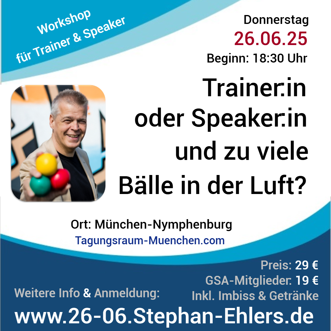 In diesem 90-minütigen Workshop-Format gibt Ehlers nicht nur einen unterhaltsamen Einblick in seine fast 30-jährige Karriere – er vermittelt auch wertvolles Praxiswissen rund um Positionierung, Marketing, Auftritt und Tools, die im Trainings- und Speaker-Business wirklich funktionieren.