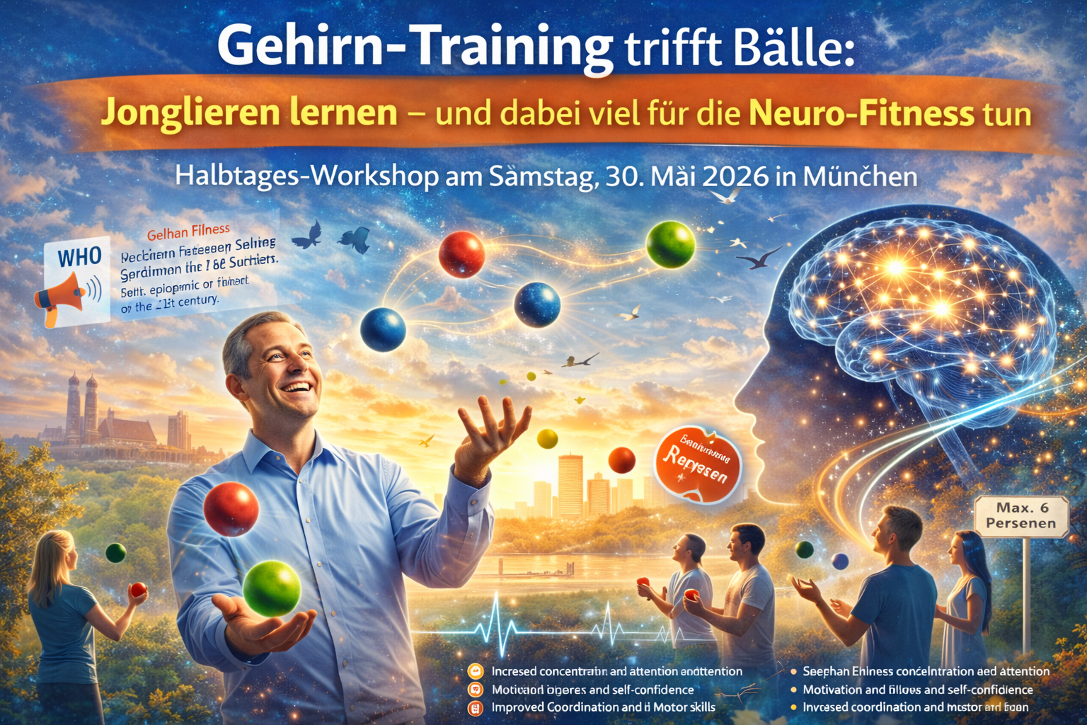 Am Samstag, 30. Mai 2026 können Lehrkräfte, Schulleiter, Übungsleiter aus Sportvereinen sowie Gesundheits- und Lerncoaches in München erleben, warum Jonglieren eines der wirksamsten Tools für Koordination und Kognition ist – und wie man es auch anderen spielend beibringt.