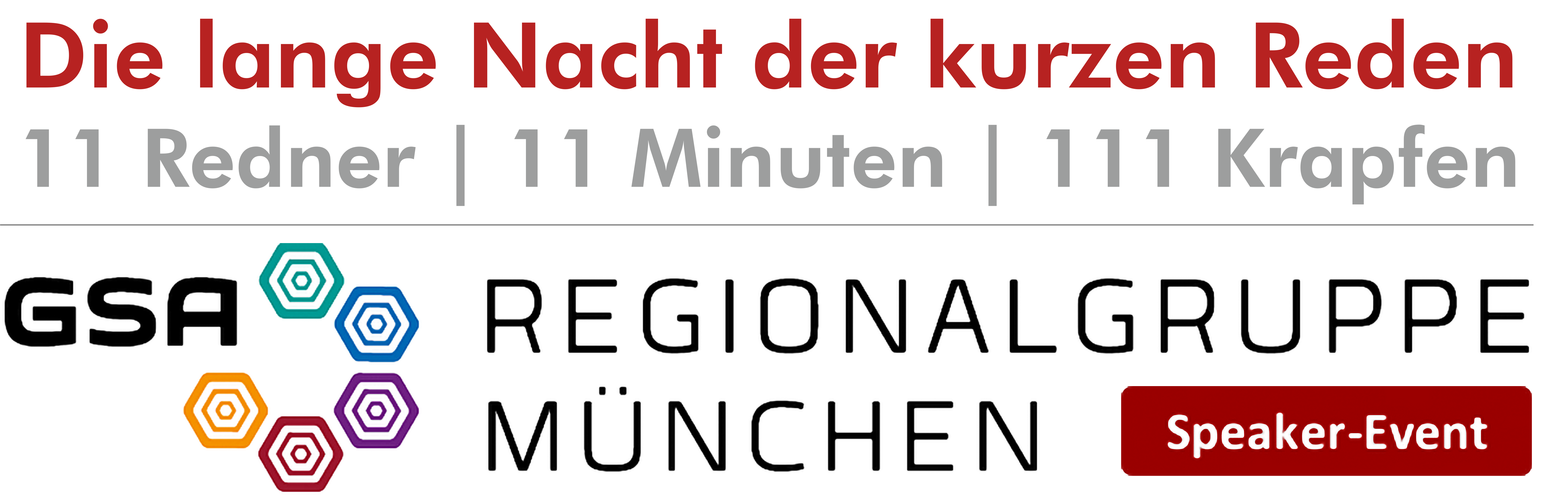 (lifepr) (München, 06.07.2017) "Die lange Nacht der kurzen Reden" ist ein Speaker-Event der GSA Regionalgruppe München und startete im Vorjahr mit einem großen Erfolg. Speaker und Zuschauer waren begeistert: 11 Redner präsentieren informativ und/oder auch interaktiv in jeweils 11 Minuten 11 interessante Themen … und das am Samstag, 11.11.2017.