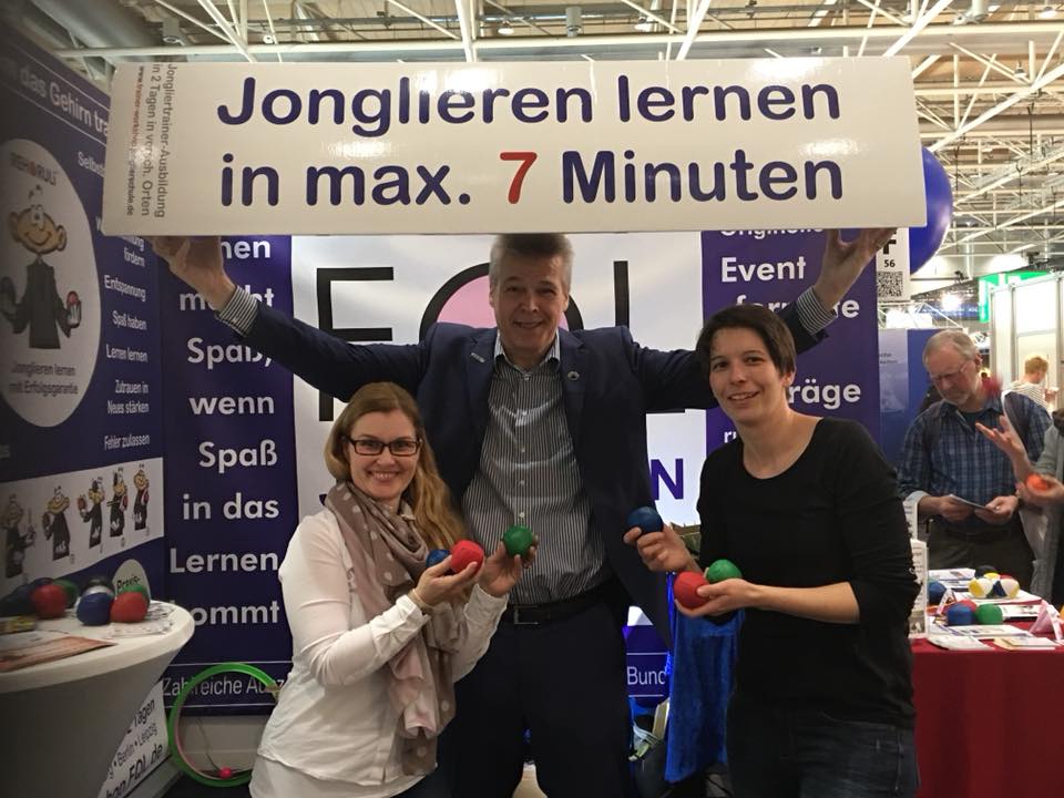 Im Forum Weiterbildung (Halle 6, E130/F139) können Messebesucher um 15 Uhr in nur 25 Minuten erleben, dass es durchaus möglich ist, in nur 7 Minuten (sieben!) das Jonglieren mit drei Bällen zu lernen ... aber auch, dass das Jonglieren sowohl für die Aufmerksamkeit/Konzentration und Lernmotivation enorm hilfreich ist. Zuerst wird jongliert, im zweiten Teil wird fundiert erklärt, warum und wie das Jonglieren im Gehirn wirkt.